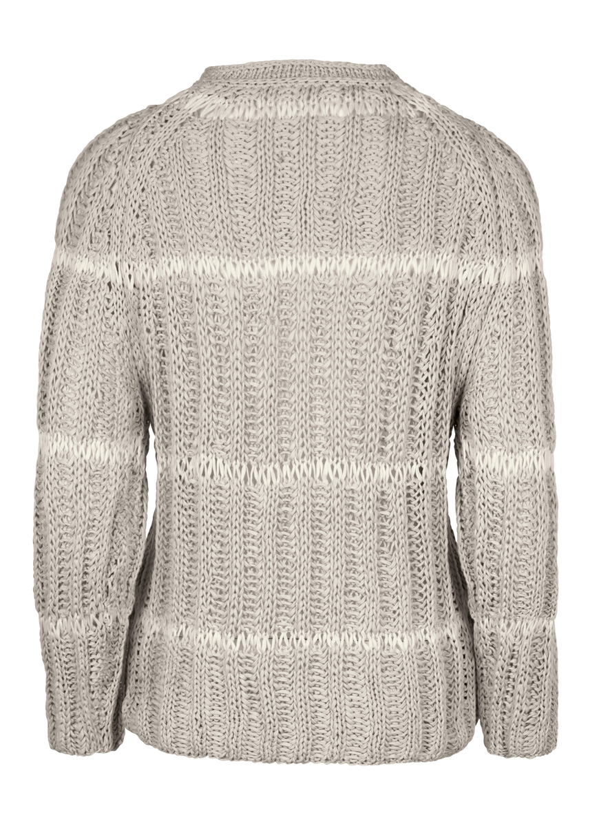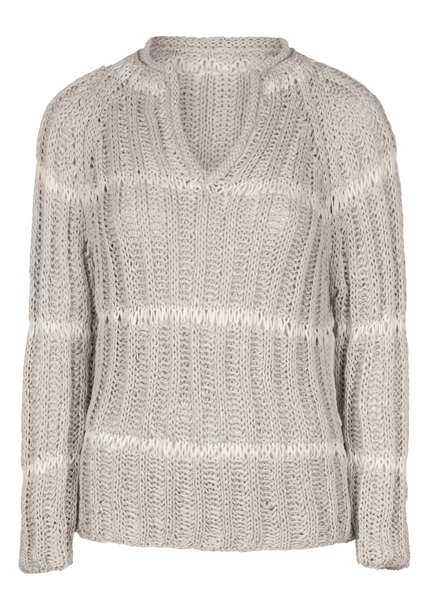 400 (450) g of Lana Grossa Certo (100% GOTS cotton; 115 m/50 g) in Natural (col 9) and 50 (100) g in Off White (col 11). Size 7 mm needles; size 5 mm circular needle, 60 cm long; size 4 mm crochet hook
