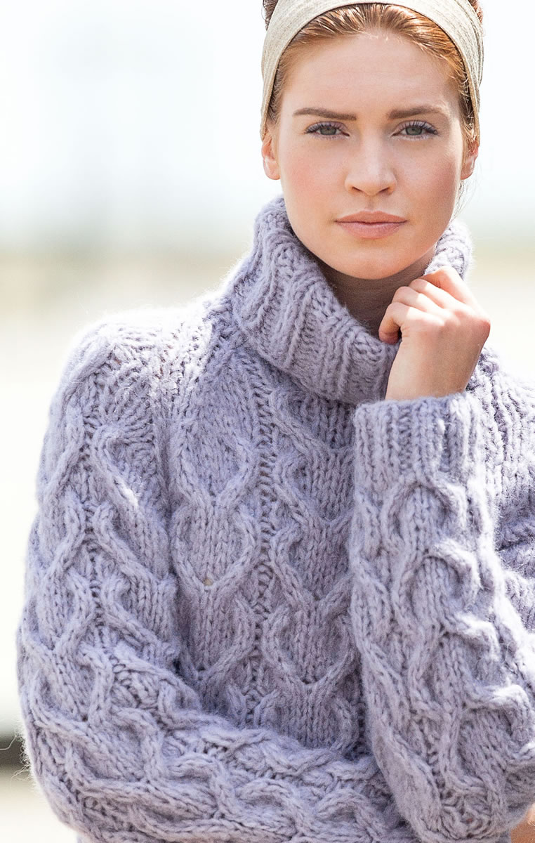 500 (600) g of Lana Grossa Cloud (80% alpaca, 14% wool, 6% polyamide; 80 m /50 g) in Lilac (col 9). Size 8 and 9 mm needles; size 8 mm circular needle, 40 cm long; cable needle [cn].