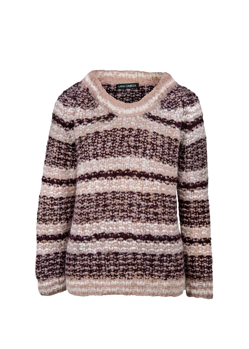 150 (200, 250) g of Lana Grossa Cloud (80% alpaca, 14% pure wool, 6% polyamide; 80 m/50 g) in Natural (col 1) and 50 (100, 150) g in Black-Red (col 18) and 200 (250, 300) g of Lana Grossa Cloud Dégradé (48% alpaca, 37% pure wool, 15% polyamide; 80 m/50 g) in Rosewood/Antique Pink/Antique Purple (col 101). Size 6 and 9 mm circular needles, each 60 cm long; size 6 mm circular needle, 40 cm long