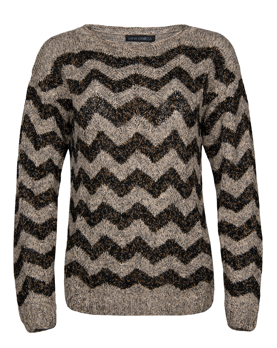 300 g of Lana Grossa Collino (45% cotton, 25% linen, 15% polyester, 15% viscose; 135 m/50 g) in Linen/ Black/White (col 4) and 200 g in Black/Brown/Natural (col 12). Size 3 and 3.5 mm needles; size 3 mm circular needle, 50 cm long