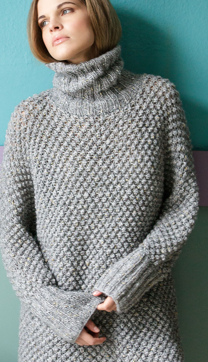 550 (600) g of Lana Grossa Cometa (34% baby alpaca, 33% polyamide, 22% viscose, 6% Merino wool, 5% polyester; 130 m/50 g) in Light Grey/Gold/Silver (col 9). Size 5 and 6 mm needles; size 6 mm circular needle, 100 cm long; size 5 mm circular needle, 50 cm long