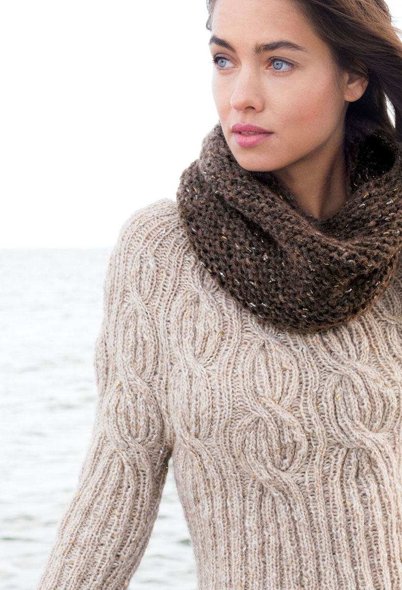 450 g of Lana Grossa Cometa (34% baby alpaca, 33% polyamide, 22% viscose, 6% Merino wool, 5% polyester; 130 m/50 g) in Beige/Gold/Silver (col 2). Size 5.5 and 6 mm needles; size 6 mm circular needles, 80 and 100 cm long; size 5.5 mm circular needle, 60 cm long; 2 cable needles [cn]; size 5 mm crochet hook