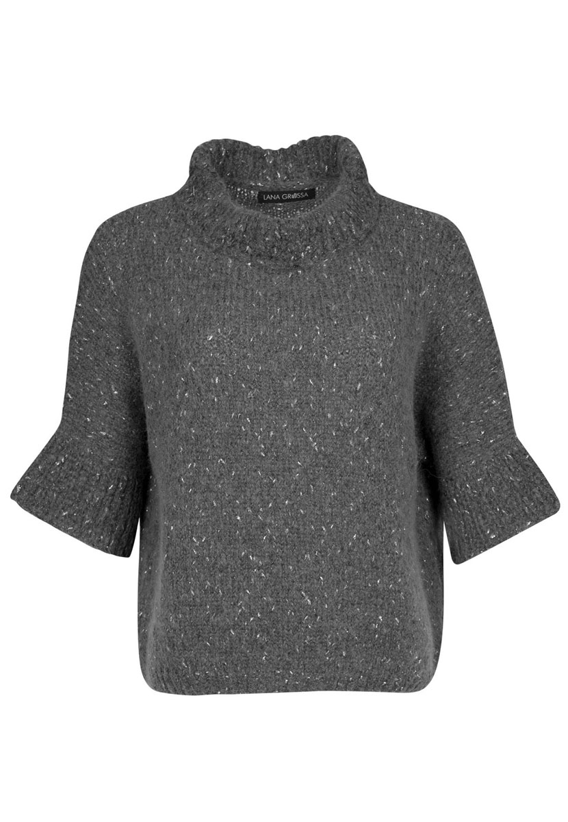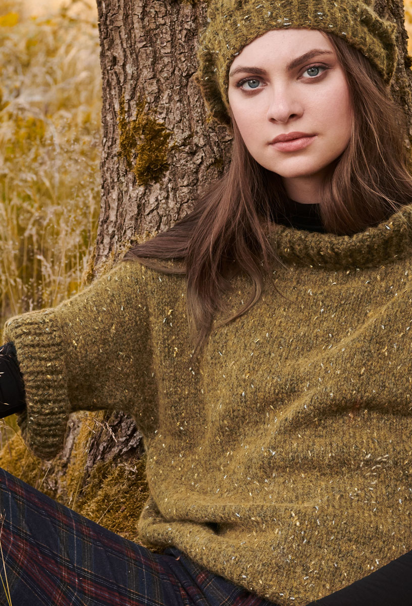 300 (350, 400) g of Lana Grossa Cometa (34% baby alpaca, 33% polyamide, 22% viscose, 6% Merino wool, 5% polyester; 130 m/50 g) in Olive/Gold/Silver (col 19). Size 4 and 5 mm needles; size 5 mm circular needle, 80 cm long; size 4 and 5.5 mm circular needles, each 50 cm long
