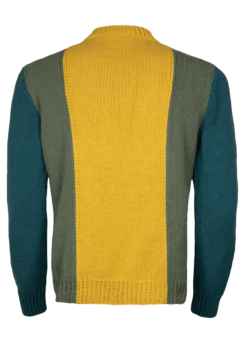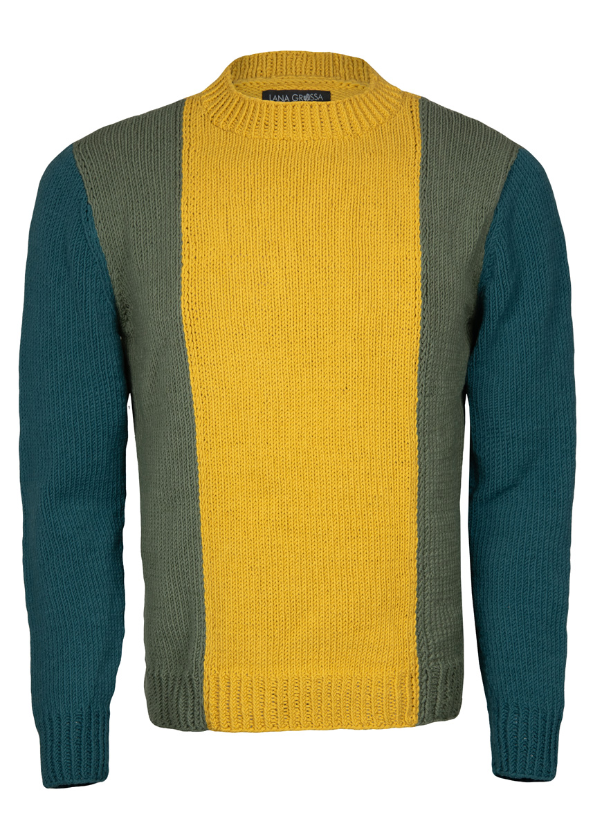 250 (300, 350) g each of Lana Grossa Cool Cotton (93% cotton, 7% Elité; 105 m/50 g) in Dark Petrol (col 37) and Oleander Green (col 36); 200 (250, 300) g in Curry (col 30). Size 5 mm needles; size 5 mm circular needle, 40 cm long.