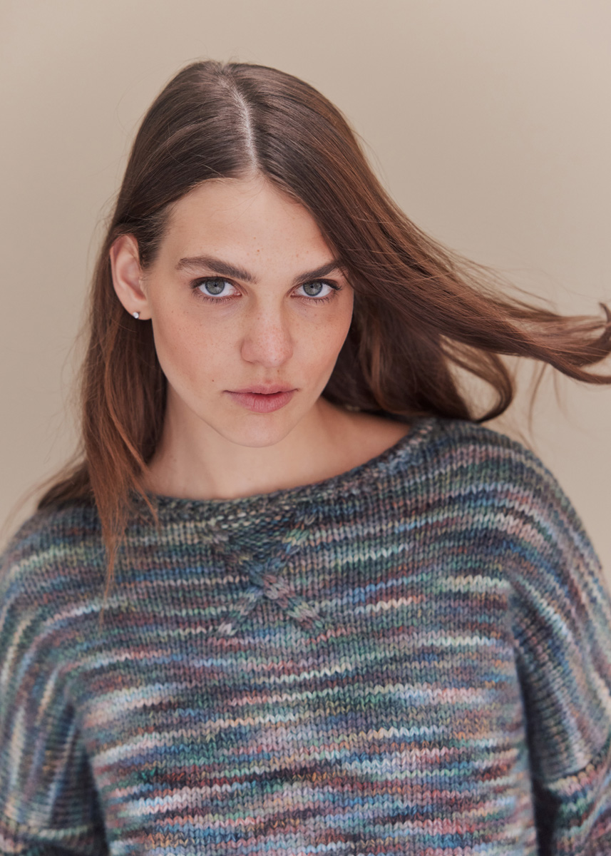 450 (500, 550, 600, 650) g of Lana Grossa Cool Merino Big Color (90% Merino wool, 10% polyamide; 90 m/50 g) in Grey/Yellow/Olive/Turquoise/Green/Dark Green/ Ochre (col 412). Size 6 and 7 mm needles; short size 6 mm circular needle; cable needle [cn].