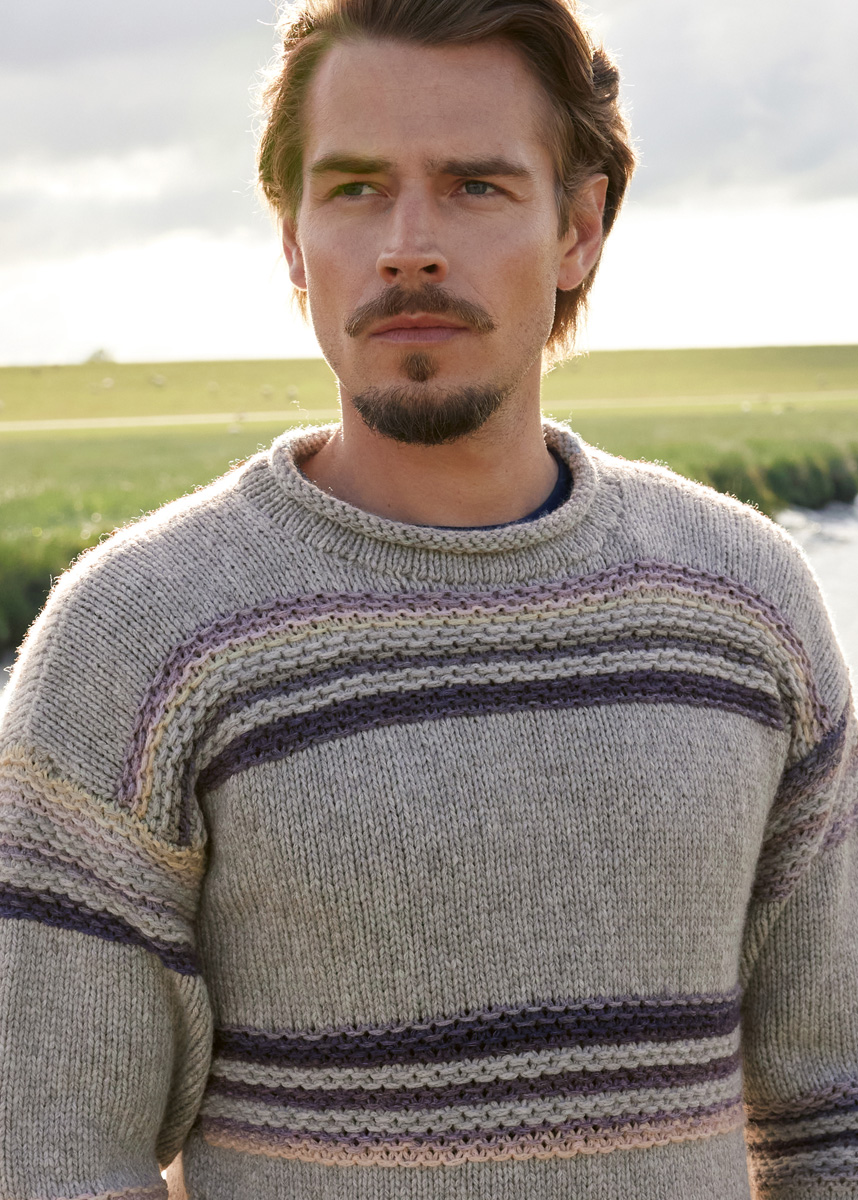 500 (550, 600) g of Lana Grossa Cool Merino Big (90% Merino wool, 10% polyamide; 90 m/50 g) in Light Grey (col 218) and 200 (300, 300) g of Lana Grossa Pappagallo (90% extrafine Merino wool, 10% polyamide; 250 m/100 g) in Grey Brown/Taupe/Midnight/Grey Blue/Black Brown/Pink Beige/Greige/Dark-/Medium Grey/Yellow (col 2). Size 6 mm needles; size 6 mm circular needle, 40 cm long.