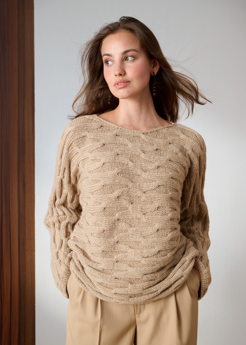 550 (600, 650) g of Lana Grossa Cool Merino (90% Merino wool, 10% polyamide; 150 m/50 g) in Beige (col 40). Short and long size 4 and 6 mm circular needles; cable needle [cn].