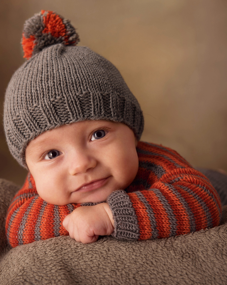 50 g each of Lana Grossa Cool Wool Baby (100% pure wool; 220 m/50 g) in Grey/Brown (col 211), Coral (col 270) and Tomato (col 271). Size 3.5 mm needles; size 3.5 mm circular needle, 40 cm long; size 3 mm crochet hook; two 10 mm buttons