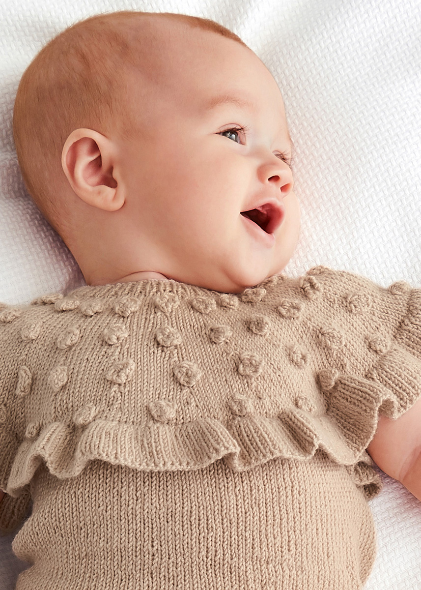 100 (100, 150, 150) g of Lana Grossa Cool Wool Baby (100% pure wool; 220 m/50 g) in Beige (col 212). Size 2.5 and 3 mm circular needles, each 40 cm long; size 2.5 mm crochet hook; one 14 mm button