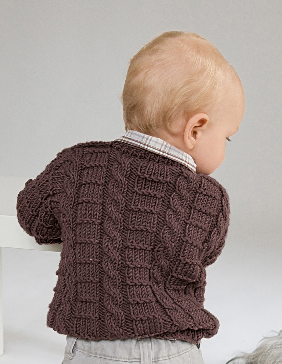 200 g of Lana Grossa Cool Wool Big (100% pure wool; 120 m/50 g) in Chestnut (col 964). Size 4.5 mm needles; size 4.5 circular needle, 40 cm long; cable needle [cn]; size 4 mm crochet hook; three buttons