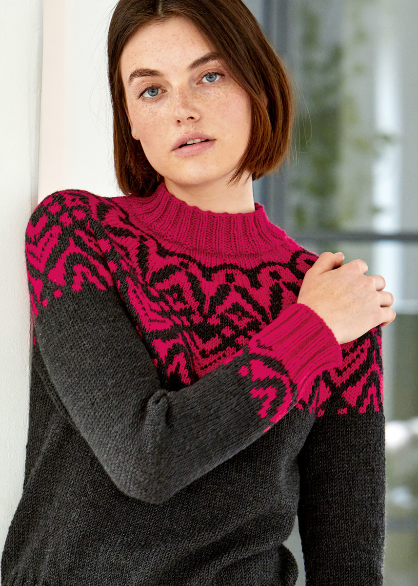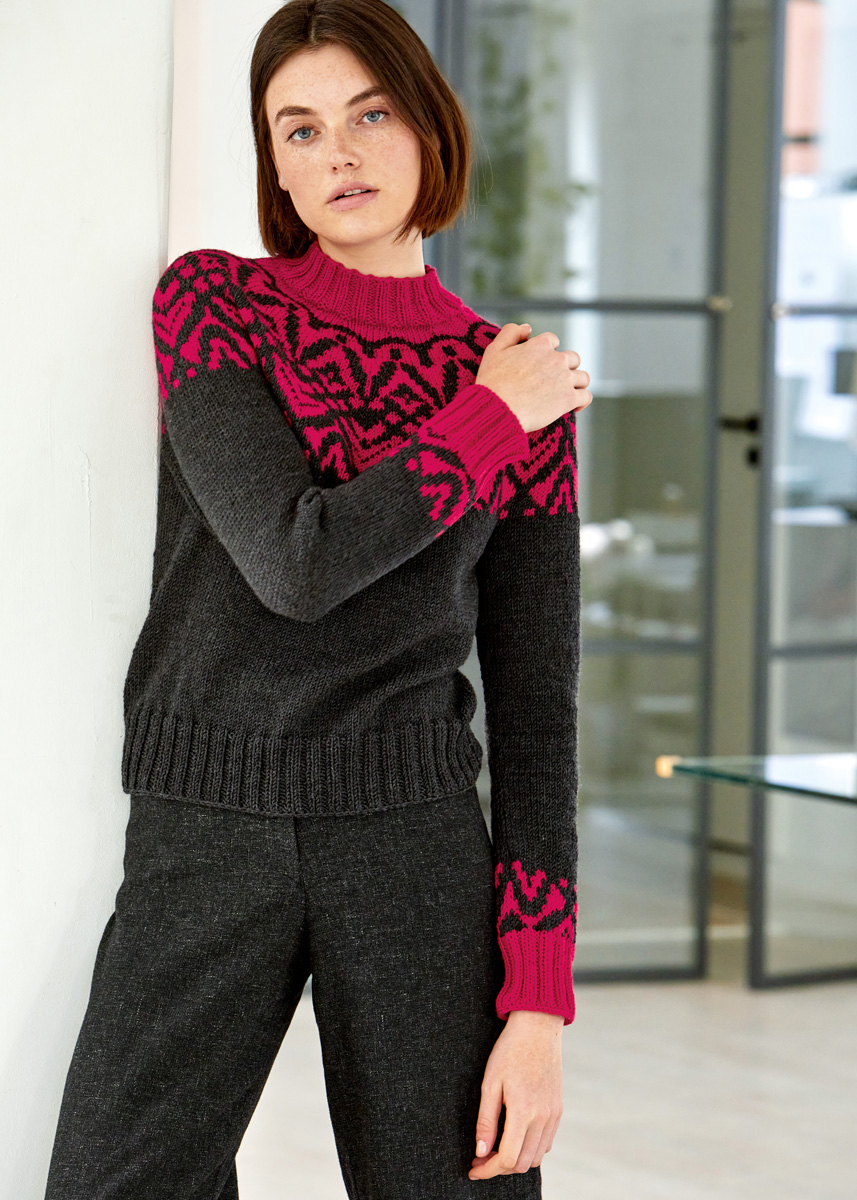 400 (450, 500, 550) g of Lana Grossa Cool Wool Big Mélange (100% pure wool; 120 m/50 g) in Charcoal Mélange (col 220); 100 (100, 100, 150) g of Lana Grossa Cool Wool Big (100% pure wool; 120 m/50 g) in Crimson (col 990). Size 4-4.5 mm circular needle; one set size 4-4.5 mm double-pointed needles [dpns]