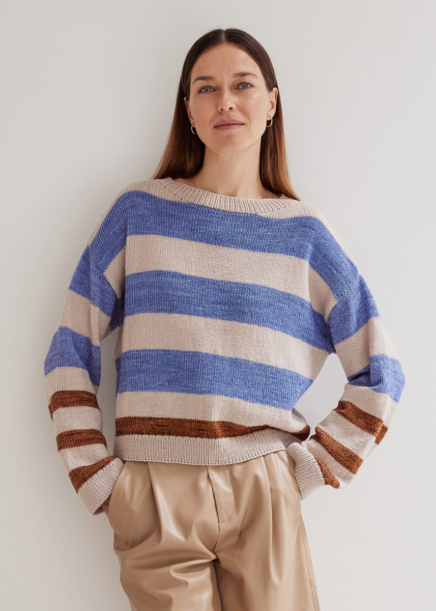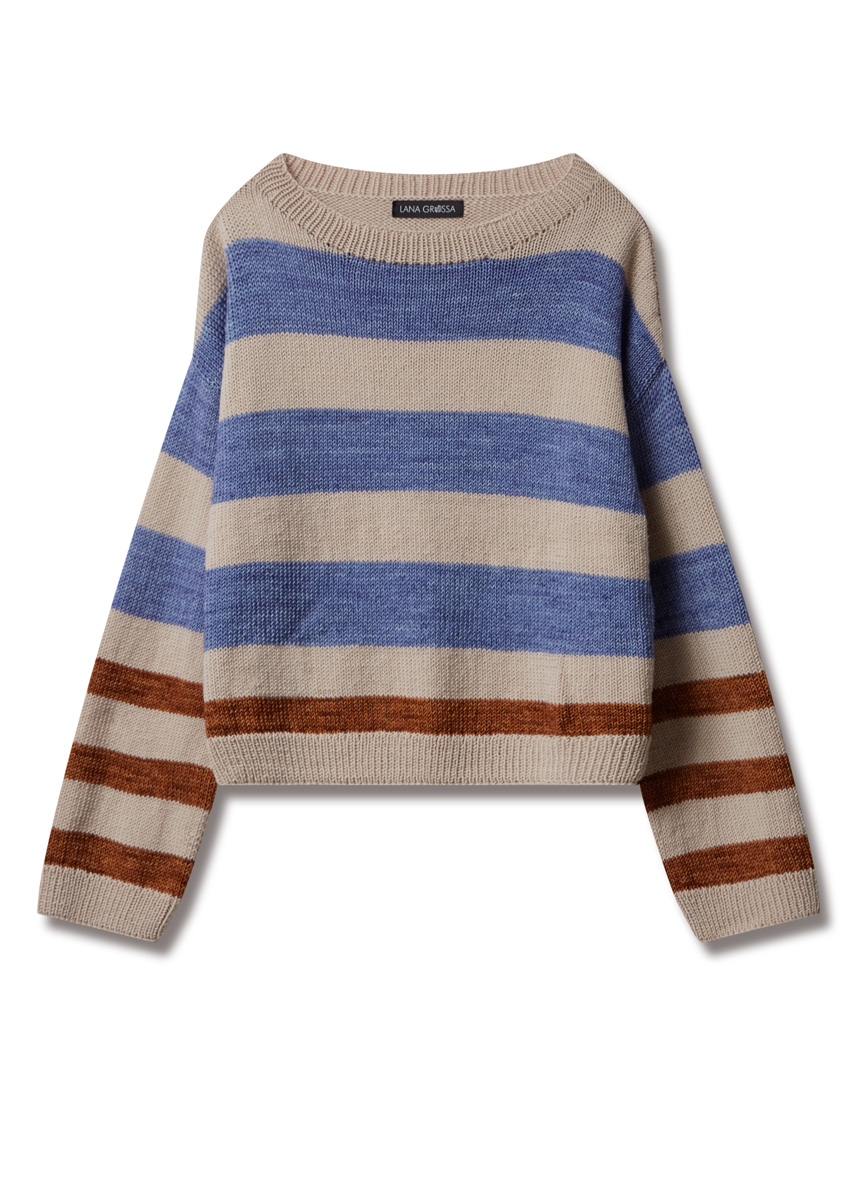 250 (300, 300, 350) g of Lana Grossa Cool Wool (100% extrafine Merino wool; 160 m/50 g) in Pearl Beige (col 2114); 150 (200, 200, 250) g of Lana Grossa Cool Wool Vintage (100% extrafine Merino wool; 160 m/50 g) in Light Blue (col 7378) and 50 (100, 100, 150) g in Doe Brown (col 7383). Size 3.5 and 4.5 mm needles; size 3.5 mm circular needle, 40 cm long.