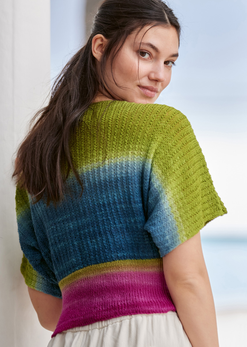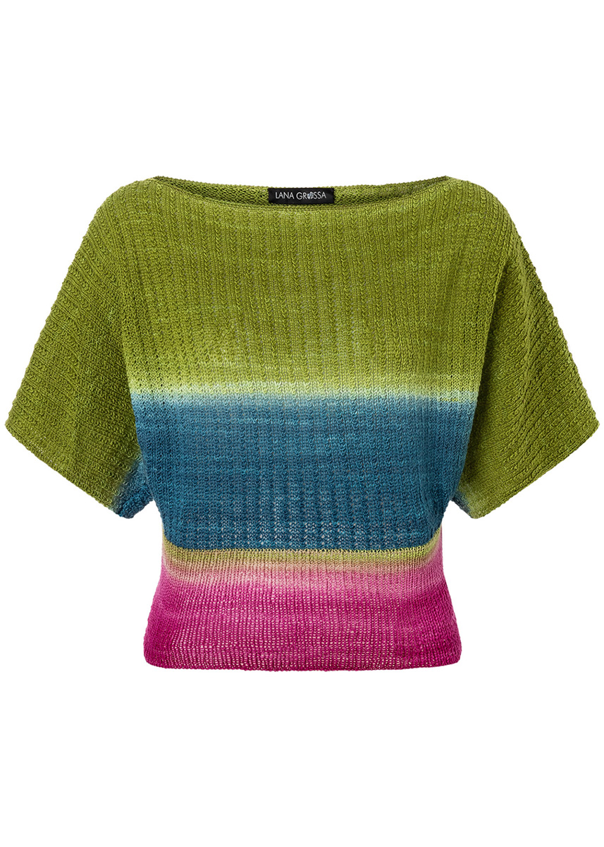 200 (200, 300) g of Lana Grossa Cool Wool Lace hand-dyed (100% extrafine Merino wool; 800 m/100 g) in Alia (col 803). Size 3 mm needles; size 2.5 mm circular needle, 60 cm long; size 2.5 mm crochet hook