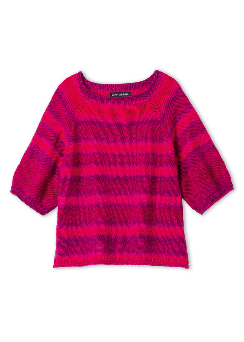 400 (400, 500, 500) g of Lana Grossa Corallo (70% organic cotton, 30% Merino wool; 210 m/100 g) in Red Violet/Fuchsia/Pink (col 4). Short and long size 4, 4.5 and 5 mm circular needles; one set each size 4, 4.5 and 5 mm double- pointed needles [dpns]; stitch markers; stitch holders.