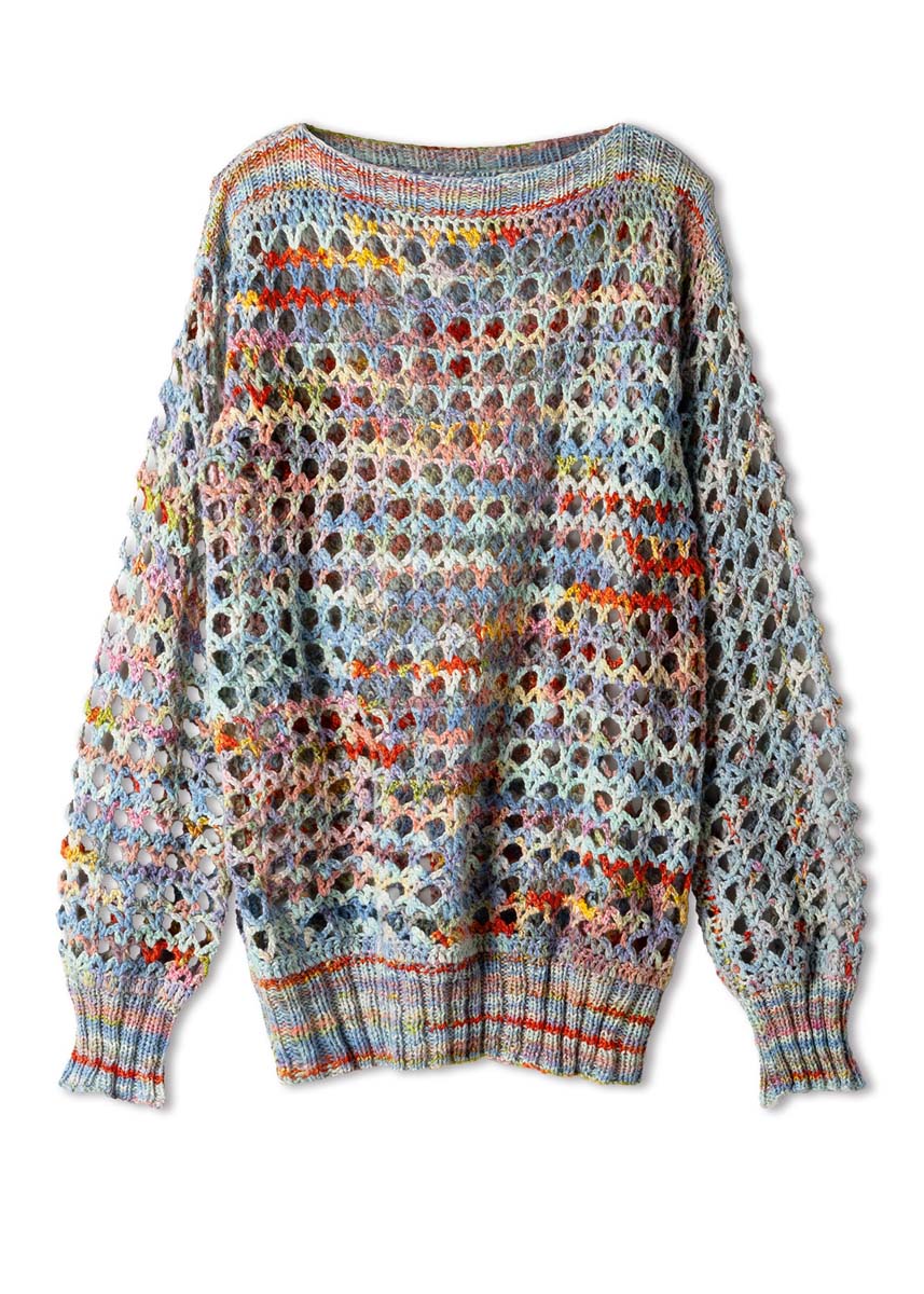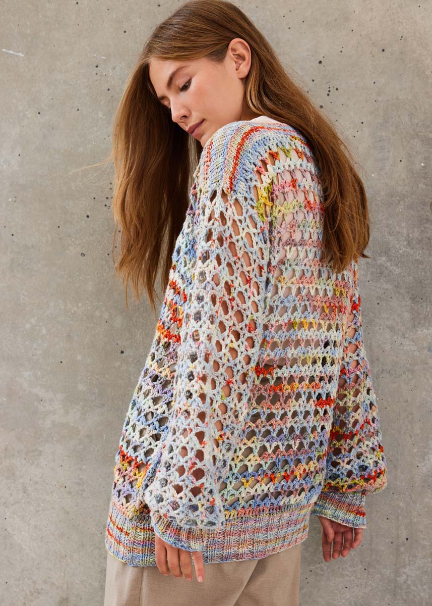 400 (500, 500, 600) g of Lana Grossa Cotonella Multi (75% cotton, 25% acrylic; 270 m/100 g) in Off White/ Light Blue/Pale Green/Yellow Green/Rust variegated (col 104). Size 5 mm crochet hook; size 4.5 mm needles.