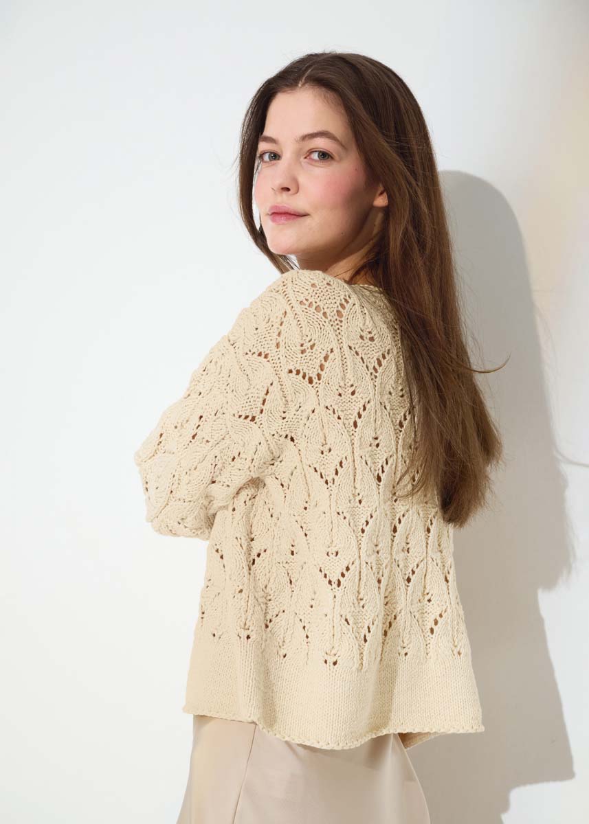 Lana Grossa Cotton Wool (53% virgin wool (extra-fine Merino), 47% cotton, running length 195 m/50 g), 500 (550 – 600 – 650) g, cream (color 12); size 4, 4.5, and 5 knitting needles and 1 size 4 circular knitting needle, 40 cm long