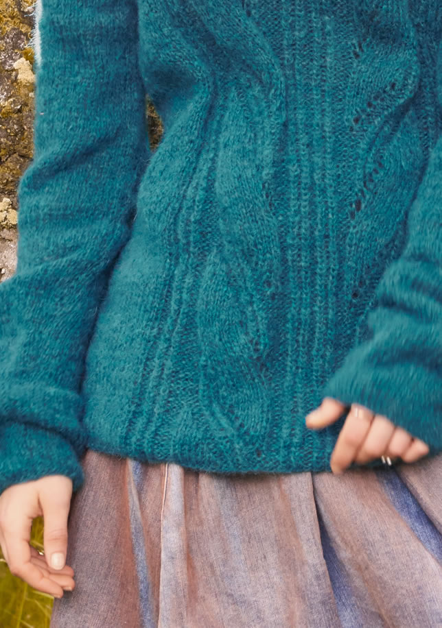 AN ULTRA SOFT BLEND of alpaca and mohair ensures comfort and lightweight warmth. The center lace panel on the pullover provides visual interest and keeps the knitting interesting. The cowl is worked separately.