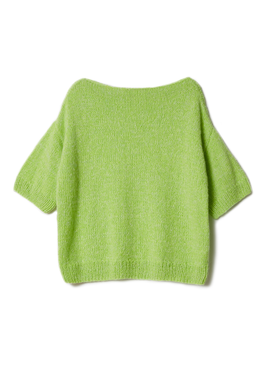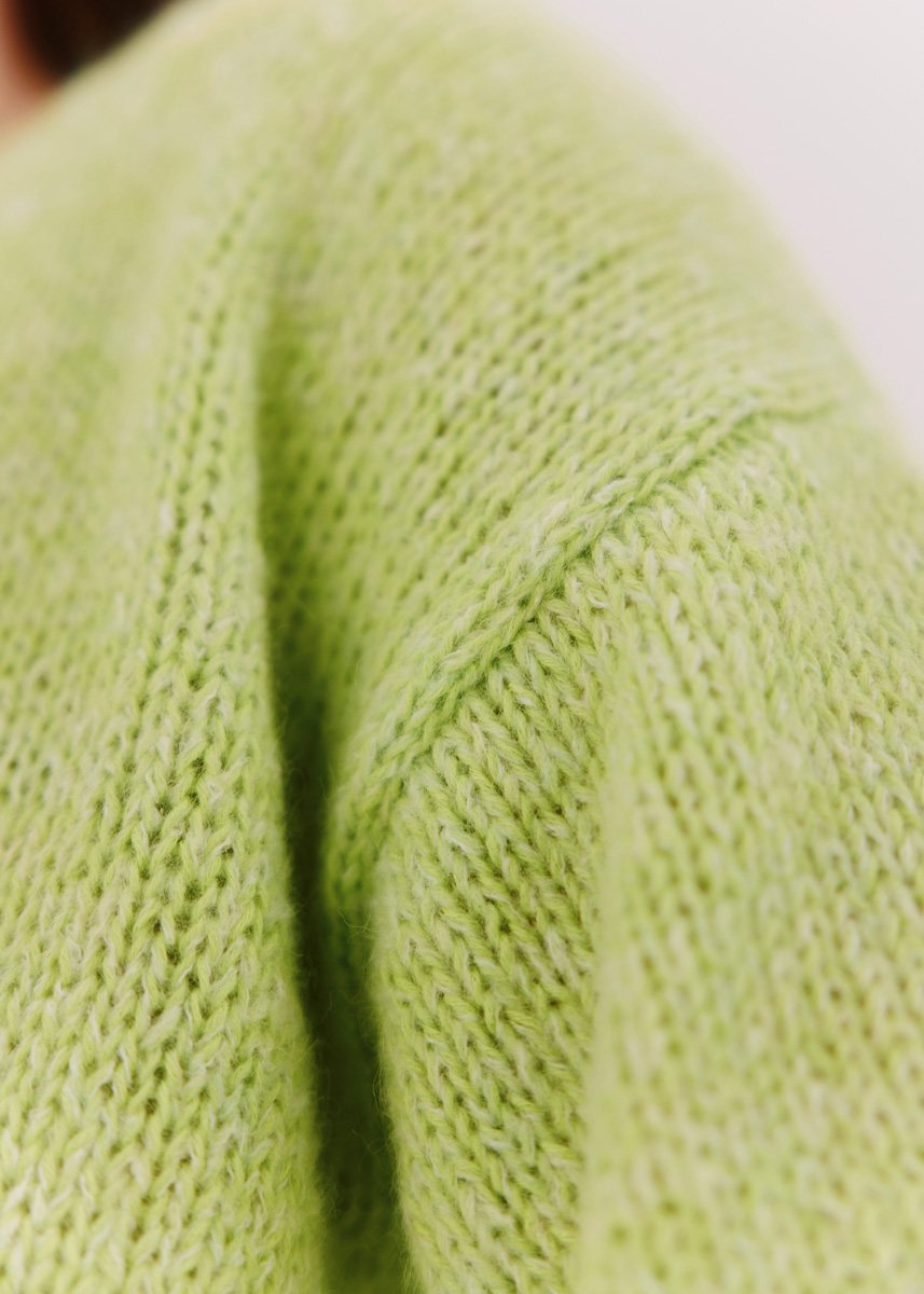 200 (200, 250, 250, 300) g of Lana Grossa Ecopuno (72% cotton, 17% Merino wool, 11% baby alpaca; 215 m/50 g) in Neon Green (col 96) and 75 (75, 100, 125, 125) g of Lana Grossa Bella (35% cotton, 30% nylon, 25% baby alpaca, 10% Merino wool; 250 m/25 g) in Yellow Green (col 8). Size 5 mm and 5.5 mm needles.