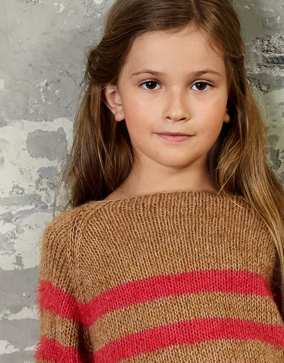 100 (150, 150) g of Lana Grossa Ecopuno (72% cotton, 17% pure wool, 11% alpaca; 215 m/50 g) in Camel (col 32); 100 (150, 150) g of Lana Grossa Estivo II (85% cotton, 15% nylon; 150 m/50 g) in Raspberry (col 3); 50 (75, 75) g of Lana Grossa Silkhair (70% superkid mohair, 30% silk; 210 m/25 g) in Gold Brown (col 115). Size 6 mm circular needle, 60 cm long
