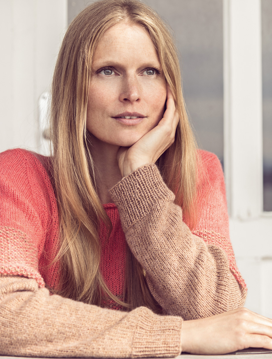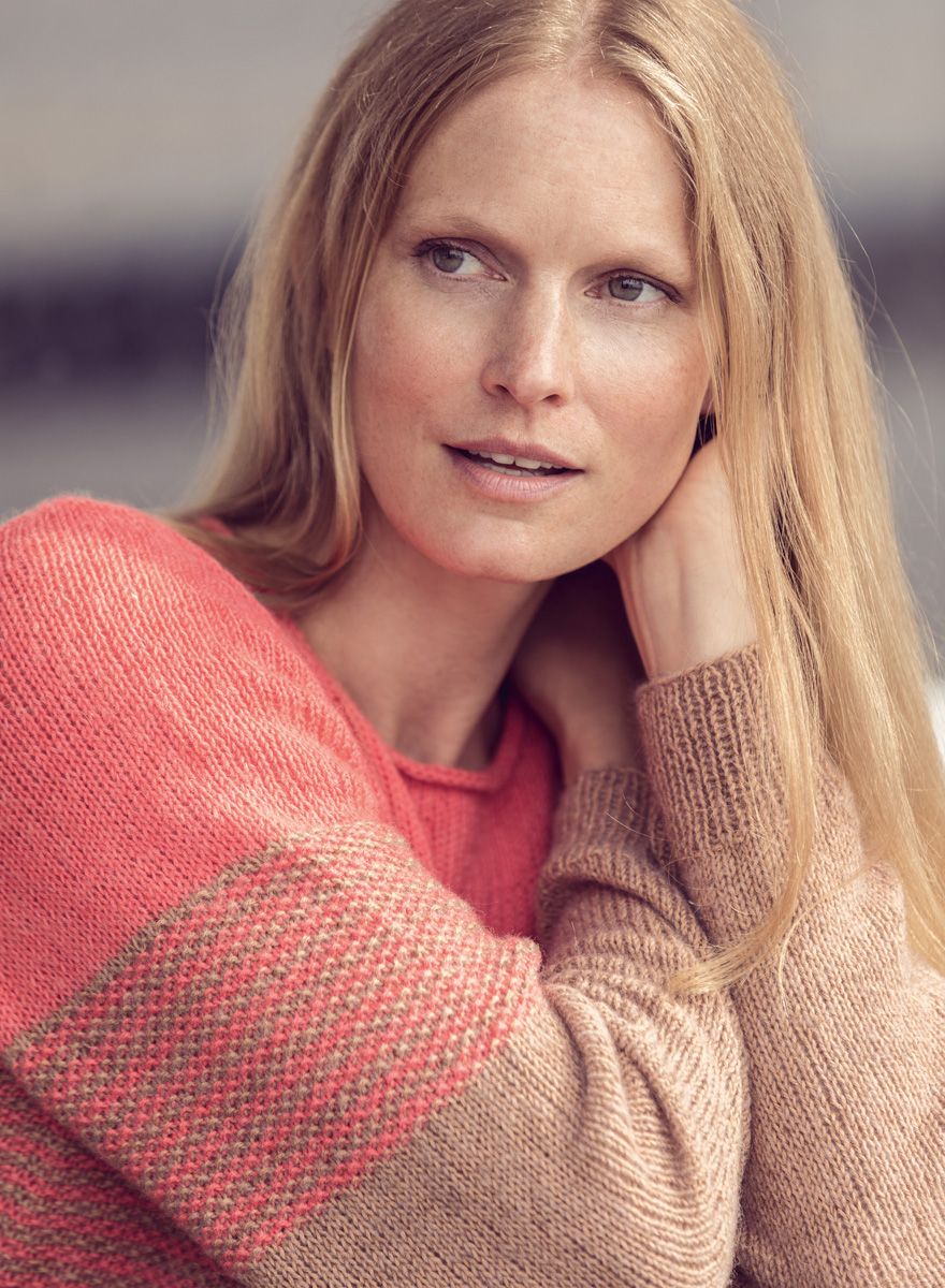 200 (250, 300) g of Lana Grossa Ecopuno (72% cotton, 17% Merino wool, 11% baby alpaca; 215 m/50 g) in Camel (col 32) and 150 (200, 200) g in Salmon (col 39). Size 4 mm needles; size 3.5 mm circular needle, 40 cm long