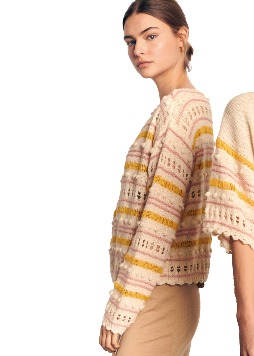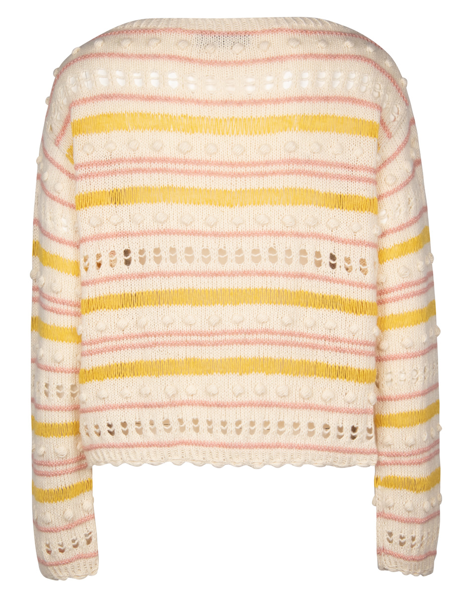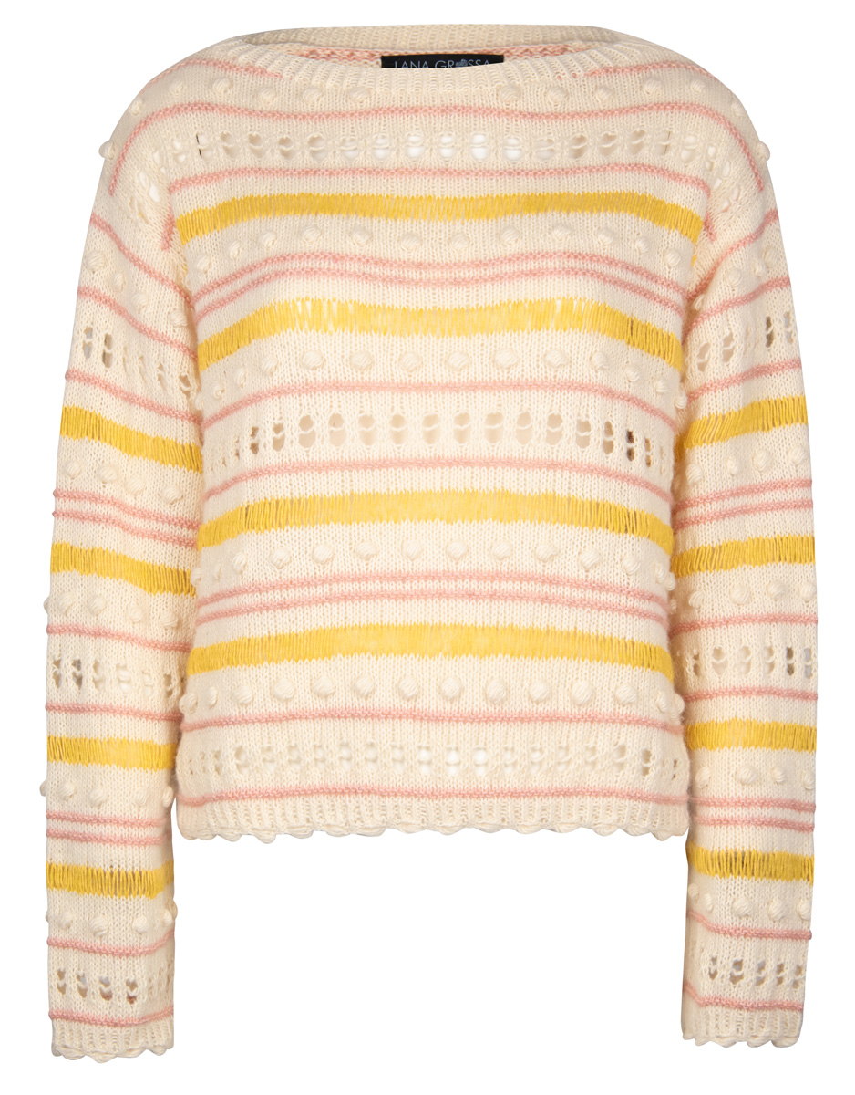 250 (300) g of Lana Grossa Ecopuno (72% cotton, 17% Merino wool, 11% baby alpaca; 215 m/50 g) in Ecru (col 46) and 50 g each in Peach (col 7) and Light Yellow (col 52). Size 3.5 and 4 mm needles; size 3.5 mm circular needle, 60 cm long