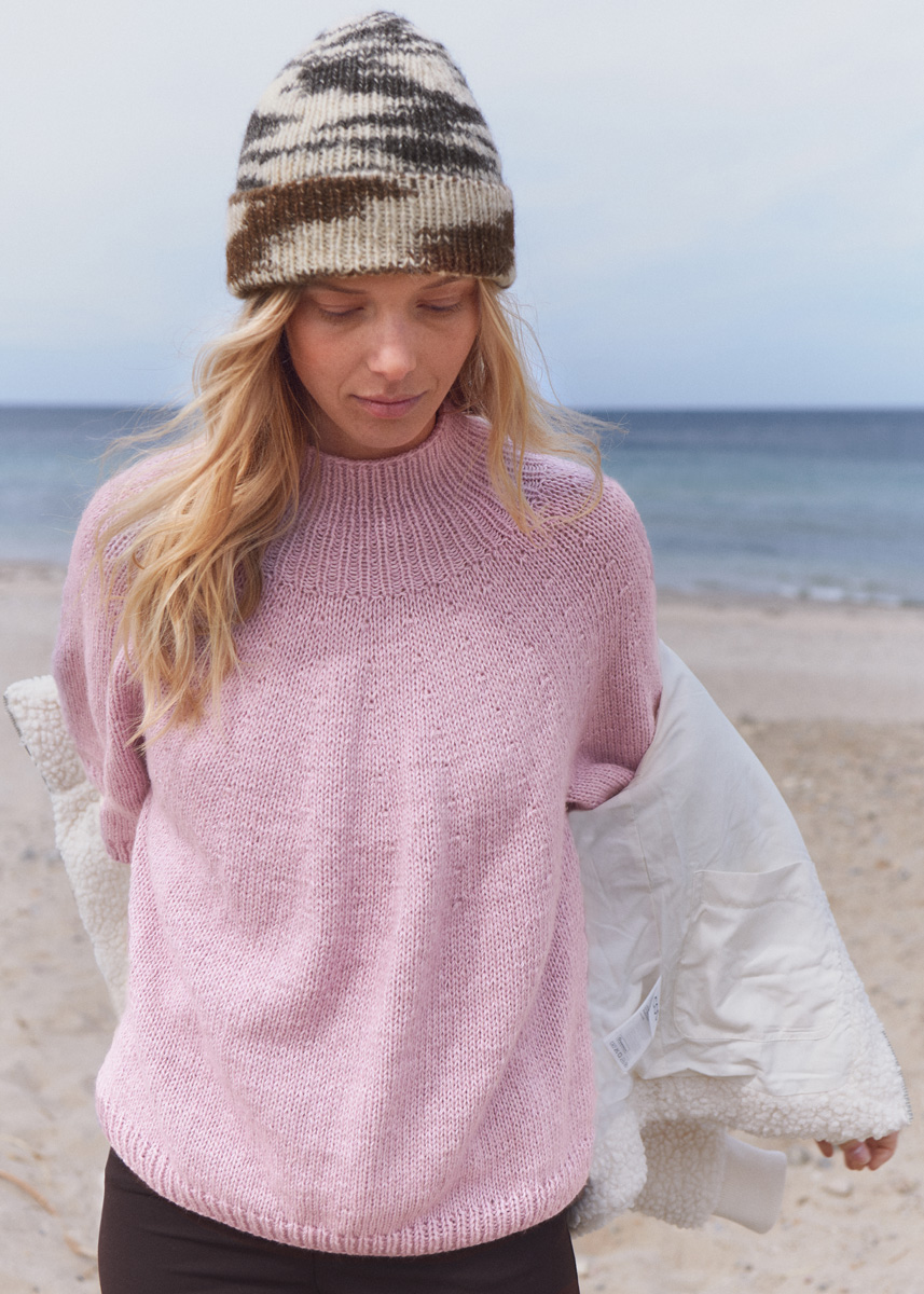 500 (550, 600, 650) g of Lana Grossa Ecopuno (72% cotton, 17% Merino wool, 11% baby alpaca; 215 m/50 g) in Lilac (col 8). Size 4 and 4.5 mm circular needles, each 40 and 80/100 cm long; stitch markers.