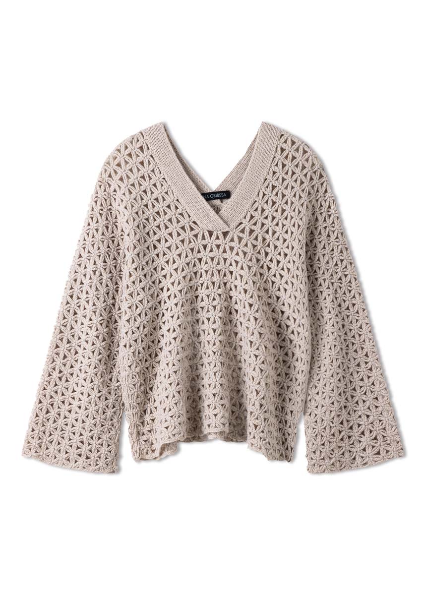350 (400) g of Lana Grossa Ecopuno (72% cotton, 17% Merino wool, 11% baby alpaca; 215 m/50 g) in Sand Beige (col 64). Size 4 mm crochet hook; size 3.5 mm needles.