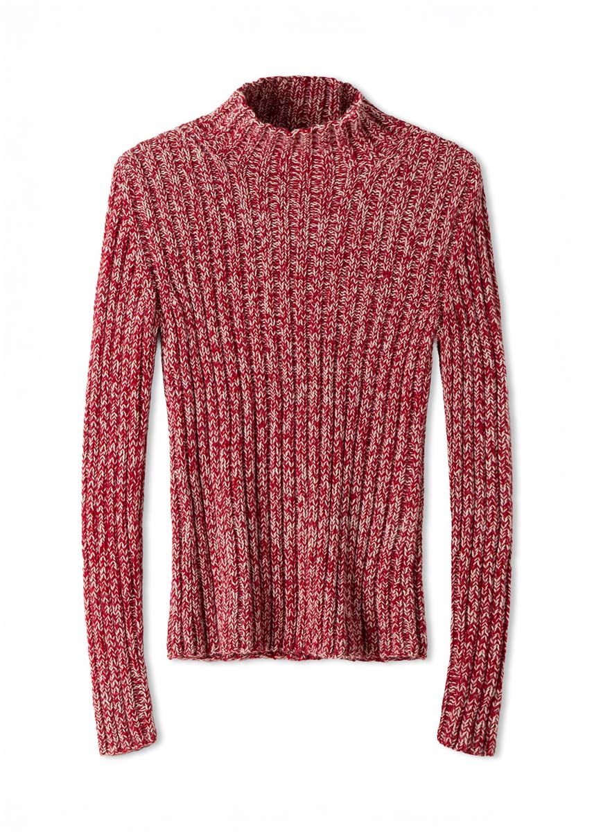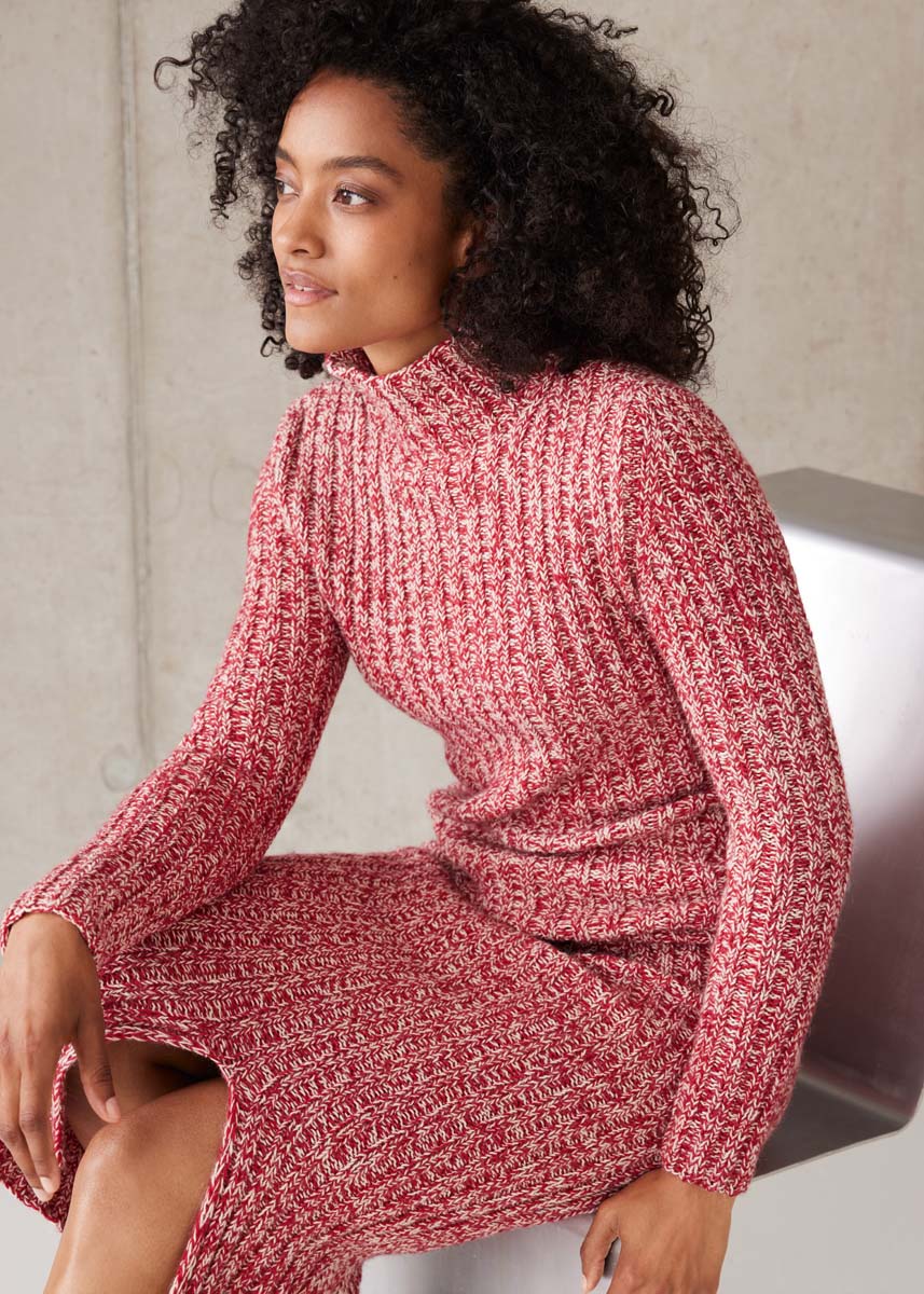 Lana Grossa Ecopuno (72 % Cotton, 17 % Virgin wool Merino, 11 % Alpaca, approx. 215 m/50 g), 300 (350 - 400) g pearl beige (col 66) and 300 (350 - 400) g cherry red (col 47); knitting needles size 4 mm; double pointed needles size 4 mm, 2 double pointed needles (to put sts on hold)