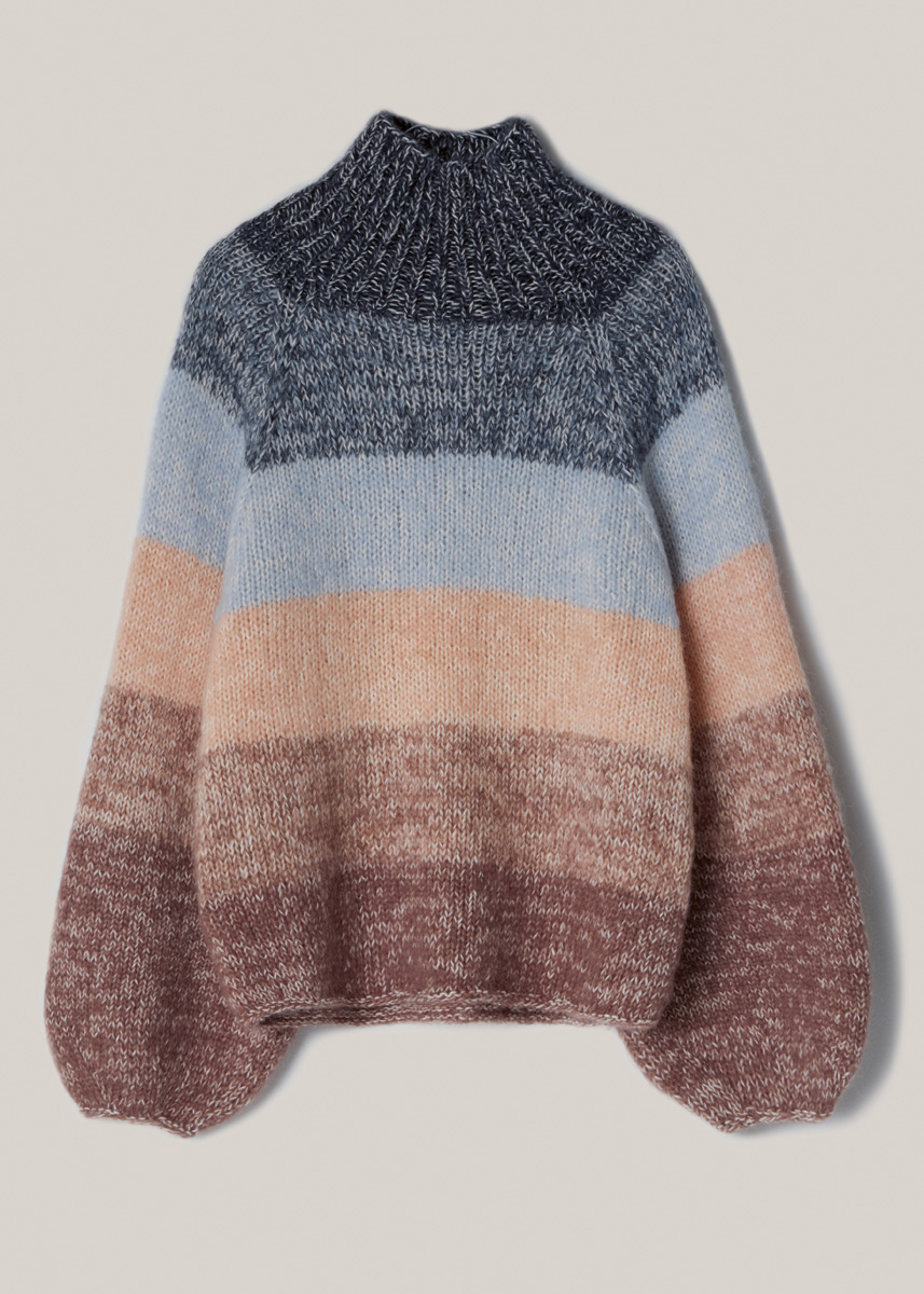 200 (250, 300) g of Lana Grossa Ecopuno (72% cotton, 17% Merino wool, 11% baby alpaca; 215 m/50 g) in Ecru (col 46), 100 (125, 125) g of Lana Grossa Setasuri (69% Suri alpaca, 31% silk; 212 m/25 g) in Nougat (col 4), 75 (100, 100) g in Peach (col 3), 50 (75, 75) g in Light Blue (col 14) and 25 (50, 50) g in Graphite Blue (col 12). Size 5 mm circular needles, 40 and 60 cm long; size 6 mm circular needles, 40, 80 and 100 cm long; one set each size 5 and 6 mm double- pointed needles [dpns].