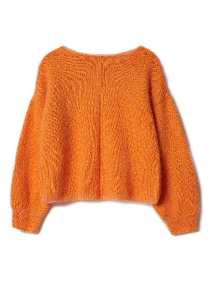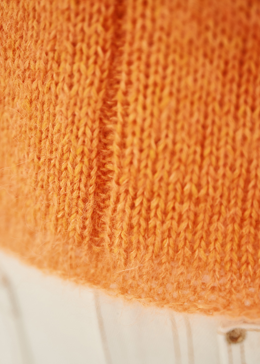 250 (250, 300, 300) g of Lana Grossa Ecopuno (72% cotton, 17% Merino wool, 11% baby alpaca; 215 m/50 g) in Mandarine (col 72) or Neon Green (col 96) and 125 (125, 150, 150) g of Lana Grossa Silkhair (70% superkid mohair, 30% silk; 210 m/25 g) in Pumpkin (col 190) or Green Yellow (col 185). Size 3.5 and 4 mm needles; short size 3.5 mm circular needle.