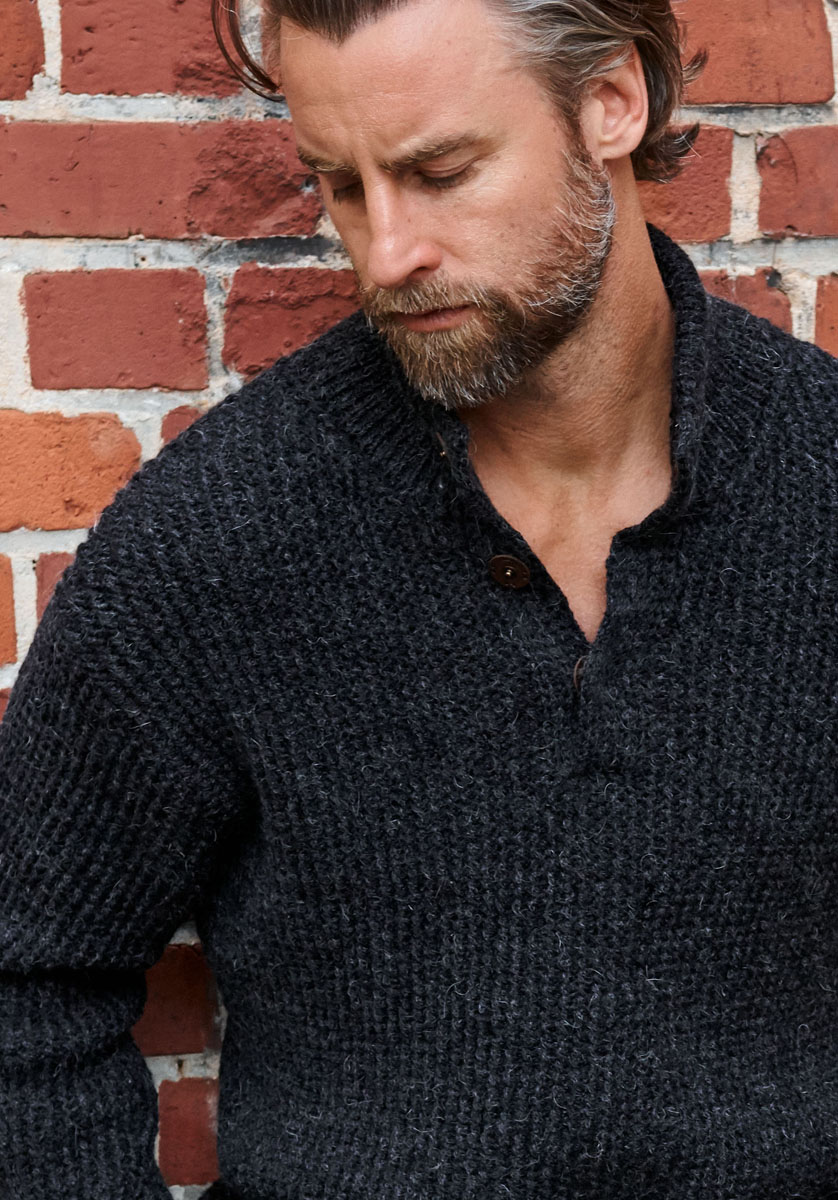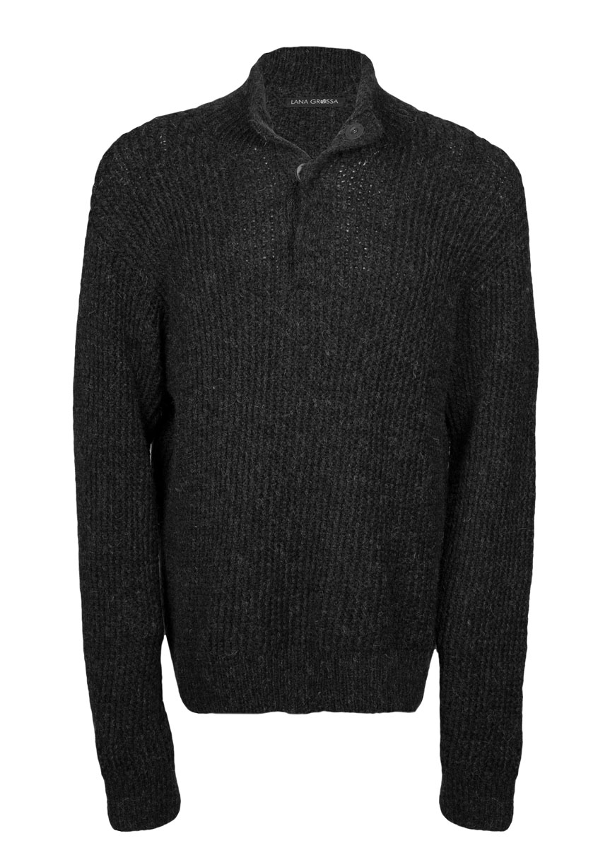 700 (750, 800) g of Lana Grossa Fatto (62% extrafine Merino wool, 26% superkid mohair, 12% acrylic; 175 m/50 g) in Charcoal (col 11). Size 4 and 5 mm needles; size 4 mm circular needle, 40 cm long; three 23 mm snap buttons in brown [by Union Knopf, item 170458]