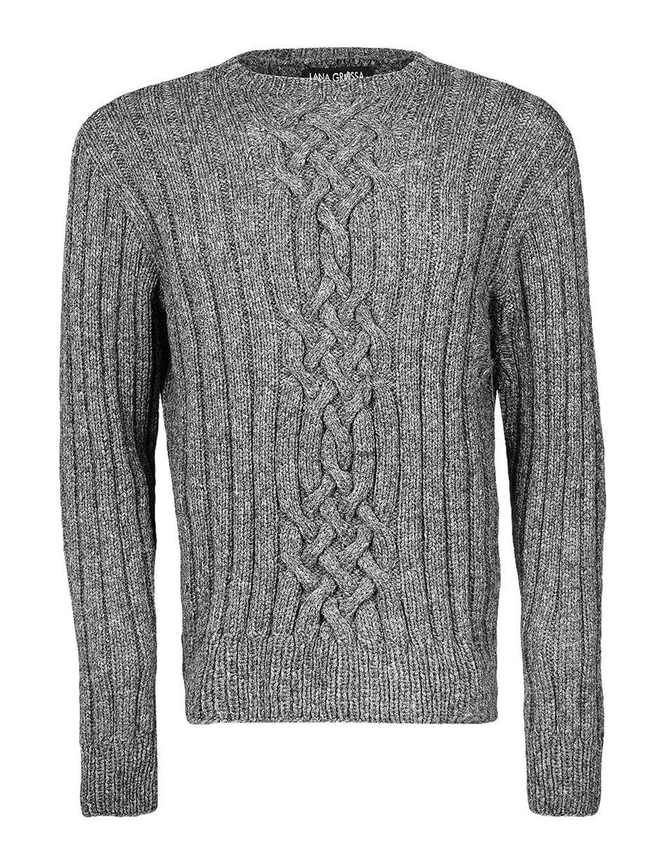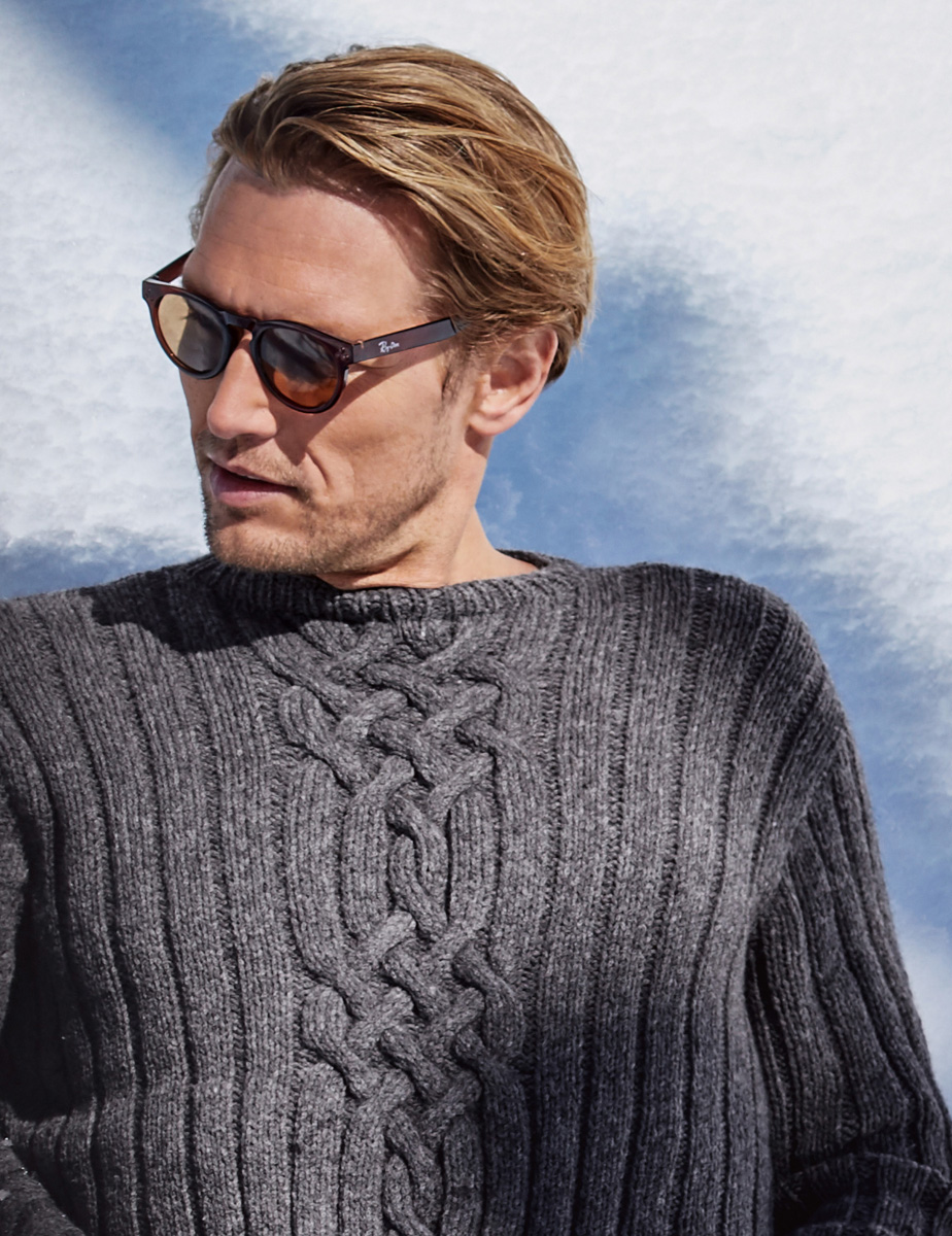 450 (500, 550) g of Lana Grossa Fatto (62% Merino wool, 26% mohair, 12% polyamide; 175 m/50 g) in Dark Grey (col 10). Size 5.5 mm needles; size 5.5 mm circular needle, 40 cm long; cable needle [cn]