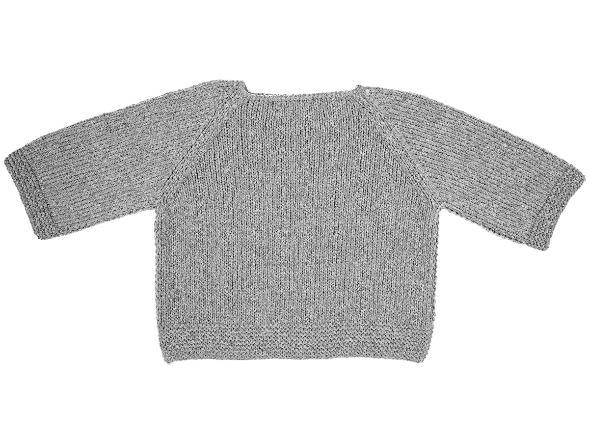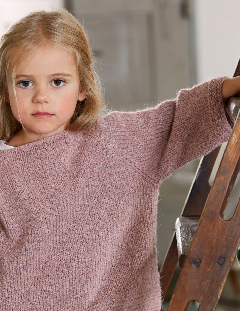 150 (200, 200) g of Lana Grossa Fatto (62% Merino wool, 26% mohair, 12% polyamide; 175 m/50 g) in Pastel Pink (col 2). Size 5.5 and 6 mm needles; size 4.5 mm crochet hook