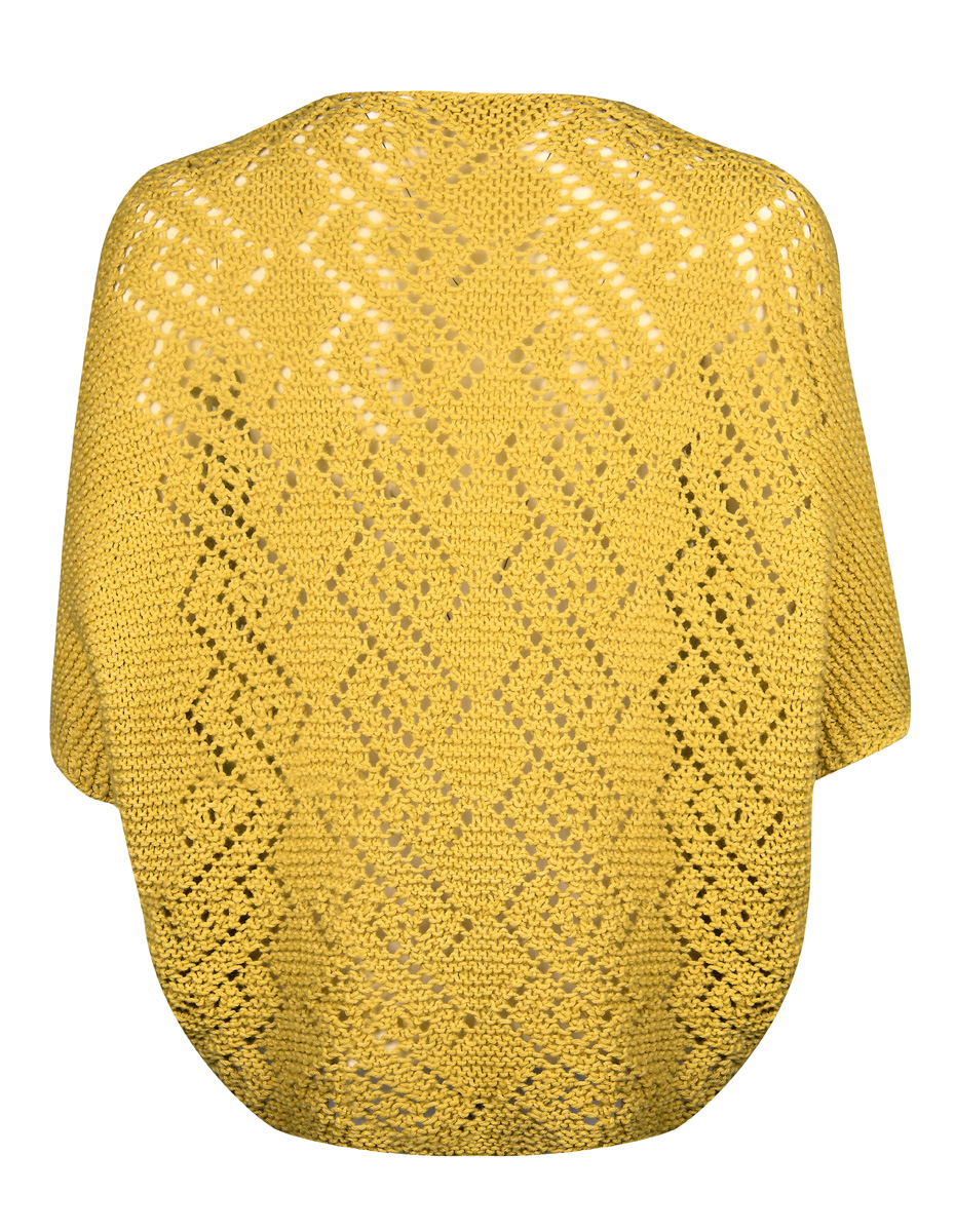 350 (400) g of Lana Grossa Fourseason (45% extrafine Merino wool, 40% organic cotton, 15% recycled cashmere; 105 m/50 g) in Yellow (col 8). Size 6 mm needles; size 6 mm circular needle, 80 cm long; size 4 mm crochet hook