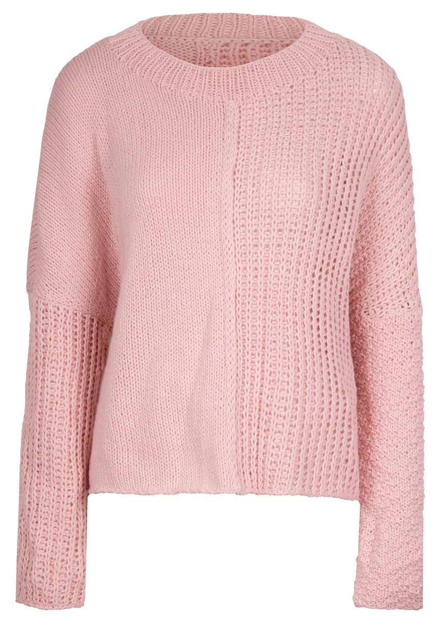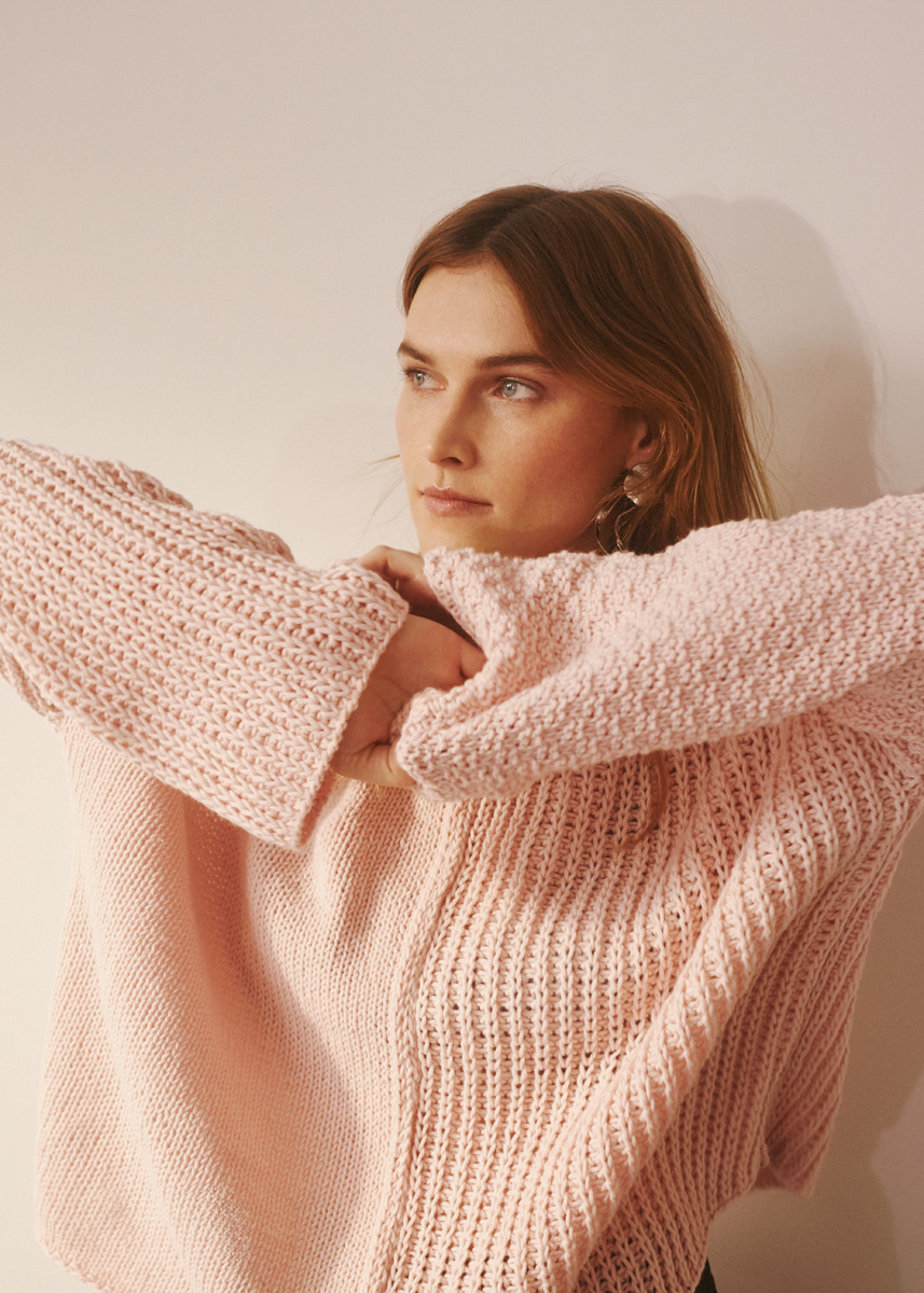 450 (550) g of Lana Grossa Fourseason (45% extrafine organic Merino wool, 40% organic cotton, 15% recycled cashmere; 105 m/50 g) in Pink (col 13). Size 6 mm needles; size 6 mm circular needle, 40 cm long.