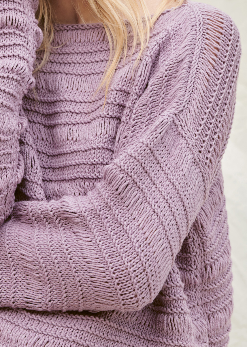 400 g of Lana Grossa Fourseason (45% extrafine organic Merino wool, 40% organic cotton, 15% recycled cashmere; 105 m/50 g) in Grey Purple (col 17). Size 5.5 mm needles