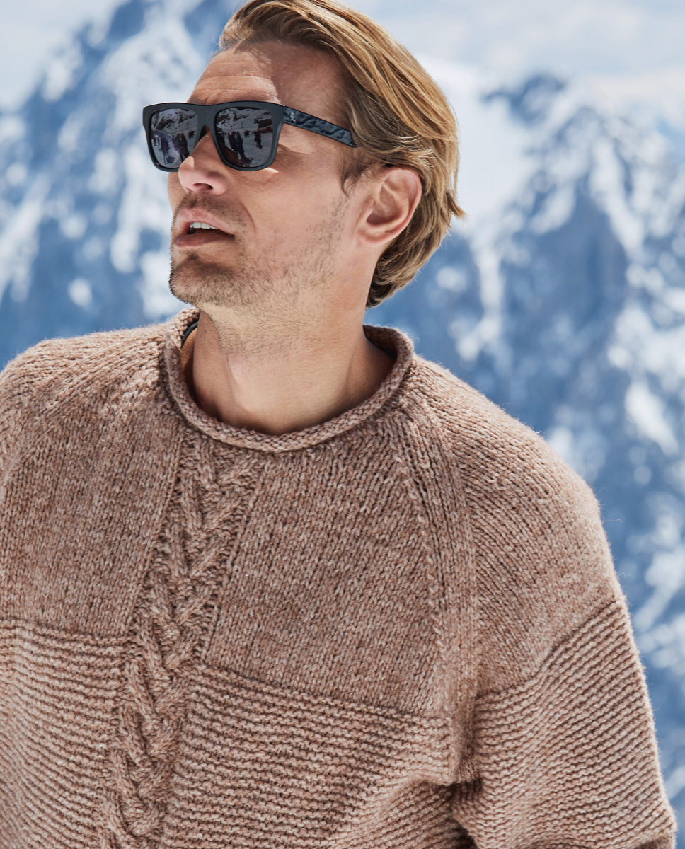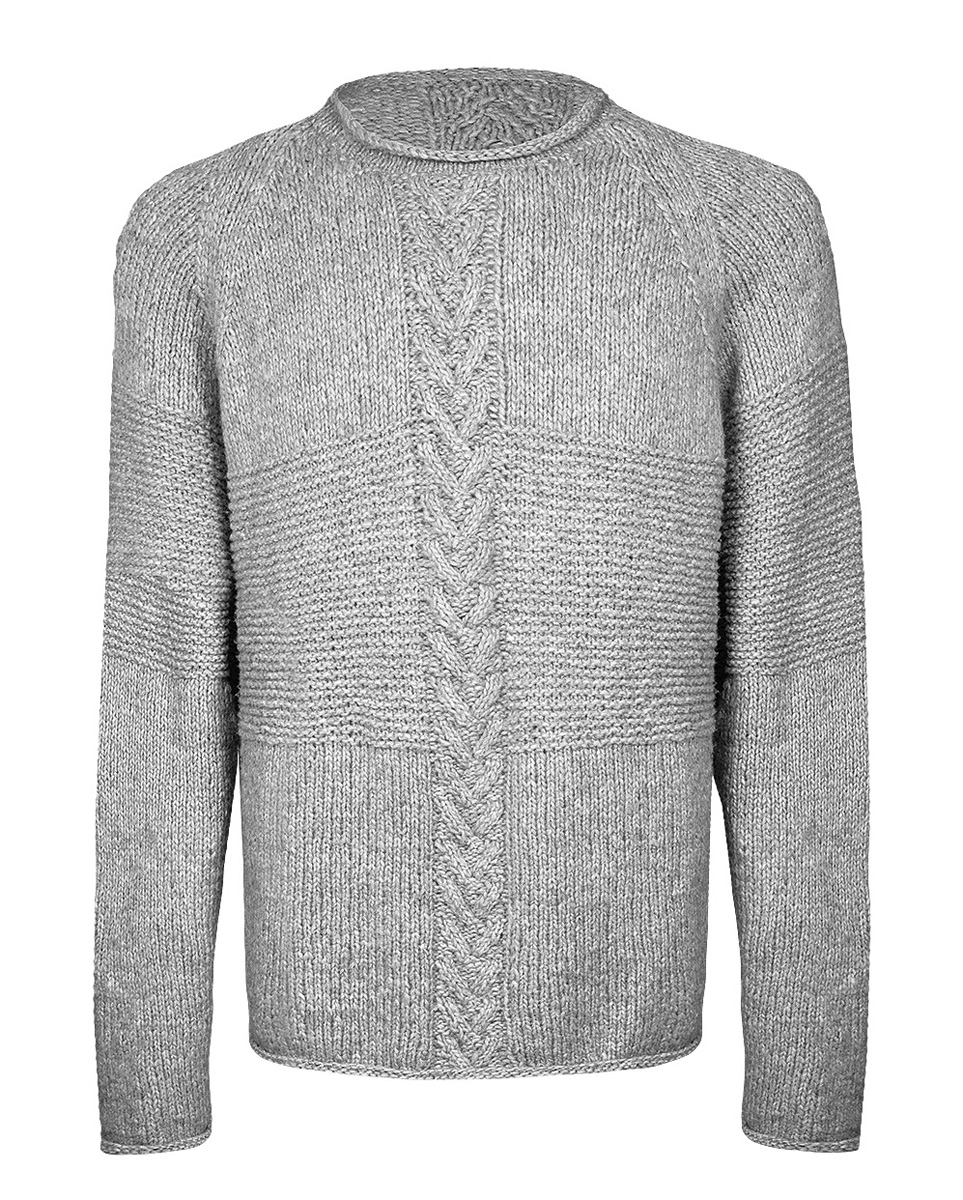 550 (600, 650) g of Lana Grossa Fusione (30% cotton, 26% extrafine Merino wool, 25% baby alpaca, 19% polyamide; 140 m/50 g) in Light Brown Mélange (col 3). Size 5 and 5.5 mm needles; size 5 mm circular needle, 40 cm long; cable needle [cn]