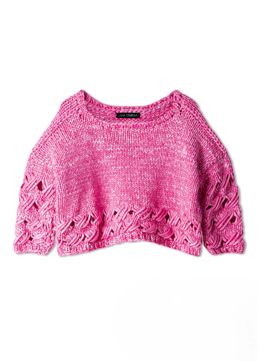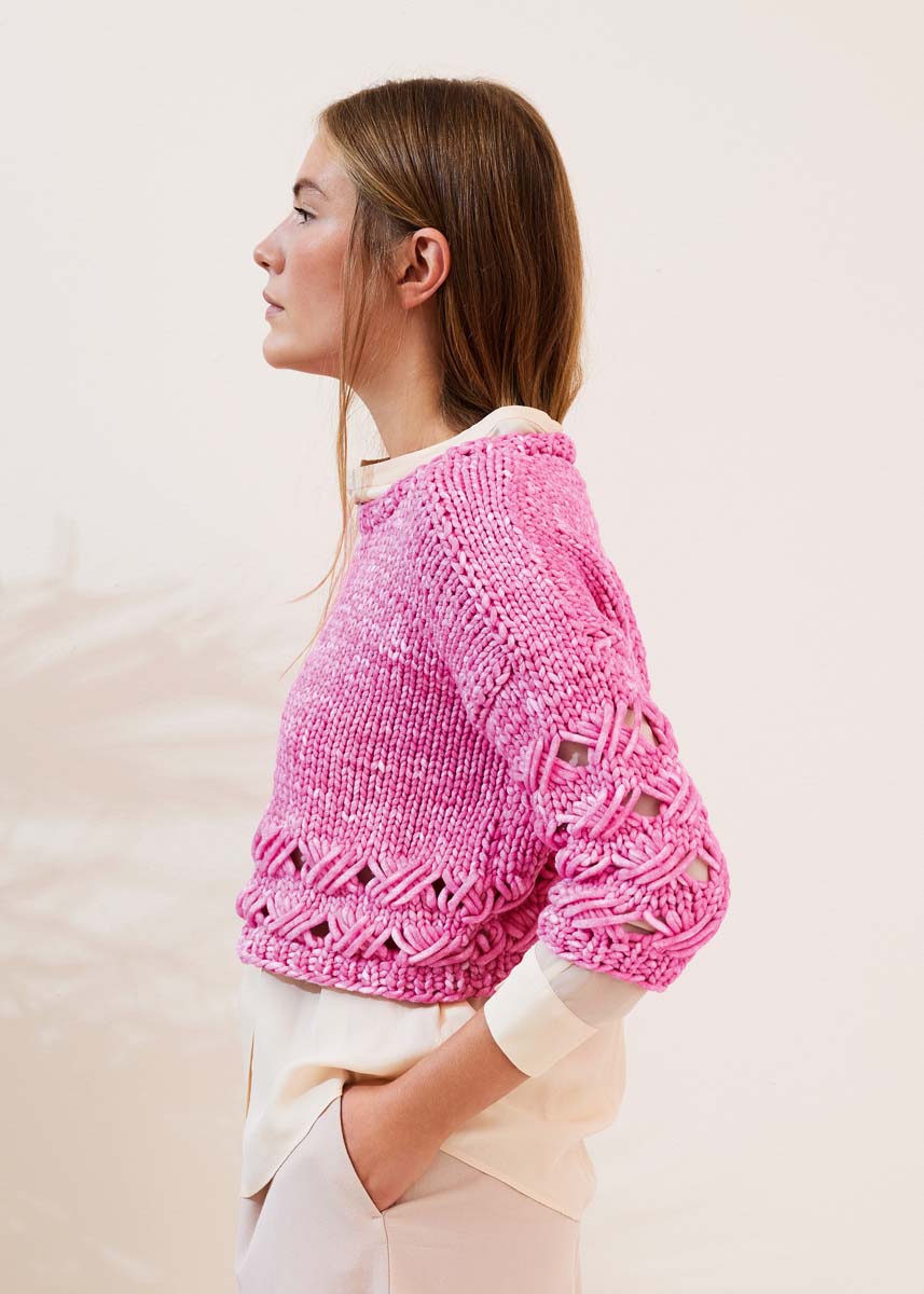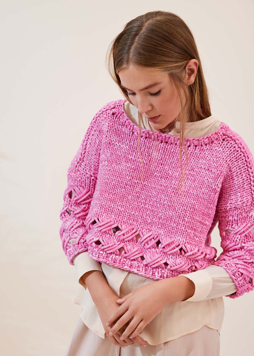 500 (600, 700) g of Lana Grossa Gelato Vintage (52% cotton, 48% recycled polyamide; 80 m/100 g) in Pink/ White (col 104). Size 12 and 15 mm needles; short size 12 mm circular needle.