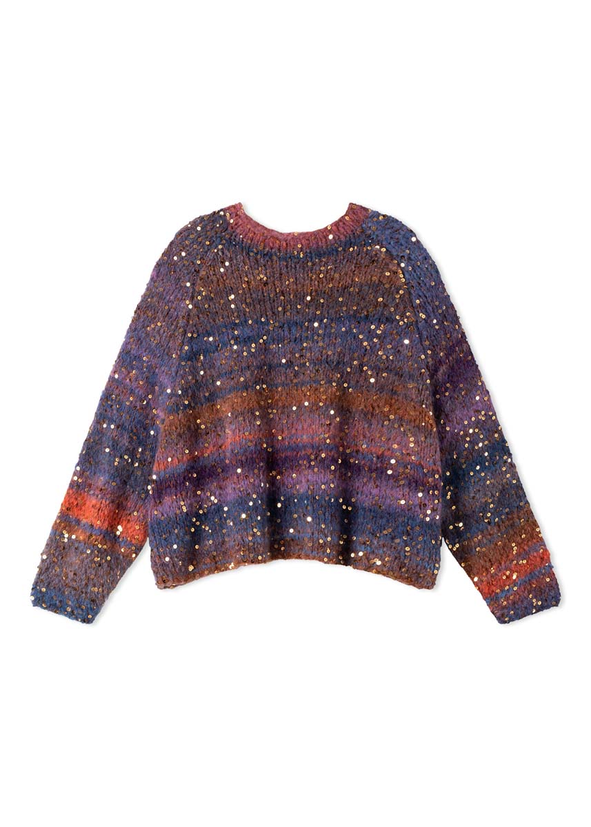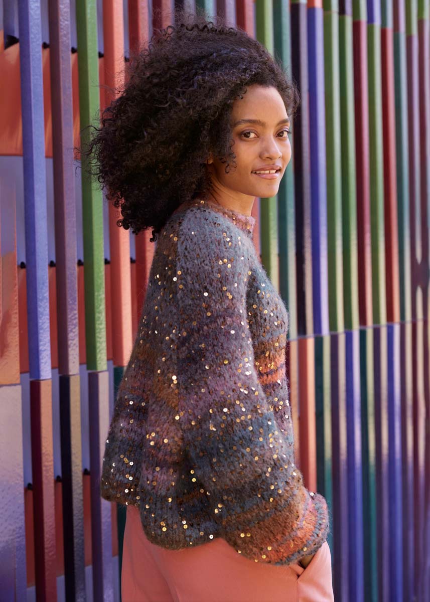 250 (300, 350) g of Lana Grossa Gigante Multi (70% fine alpaca, 30% polyamide; 150 m/50 g) in Grey Brown/ Petrol Blue/Mandarin/Grey Red/Dark Violet/Purple (col 102); 300 (300, 400) g of Lana Grossa Cosmo (100% cotton (with sequins); 260 m/100 g) in Caramel (col 8). Size 7 mm needles; size 7 mm circular needle, 50 cm long; 4 stitch holders.