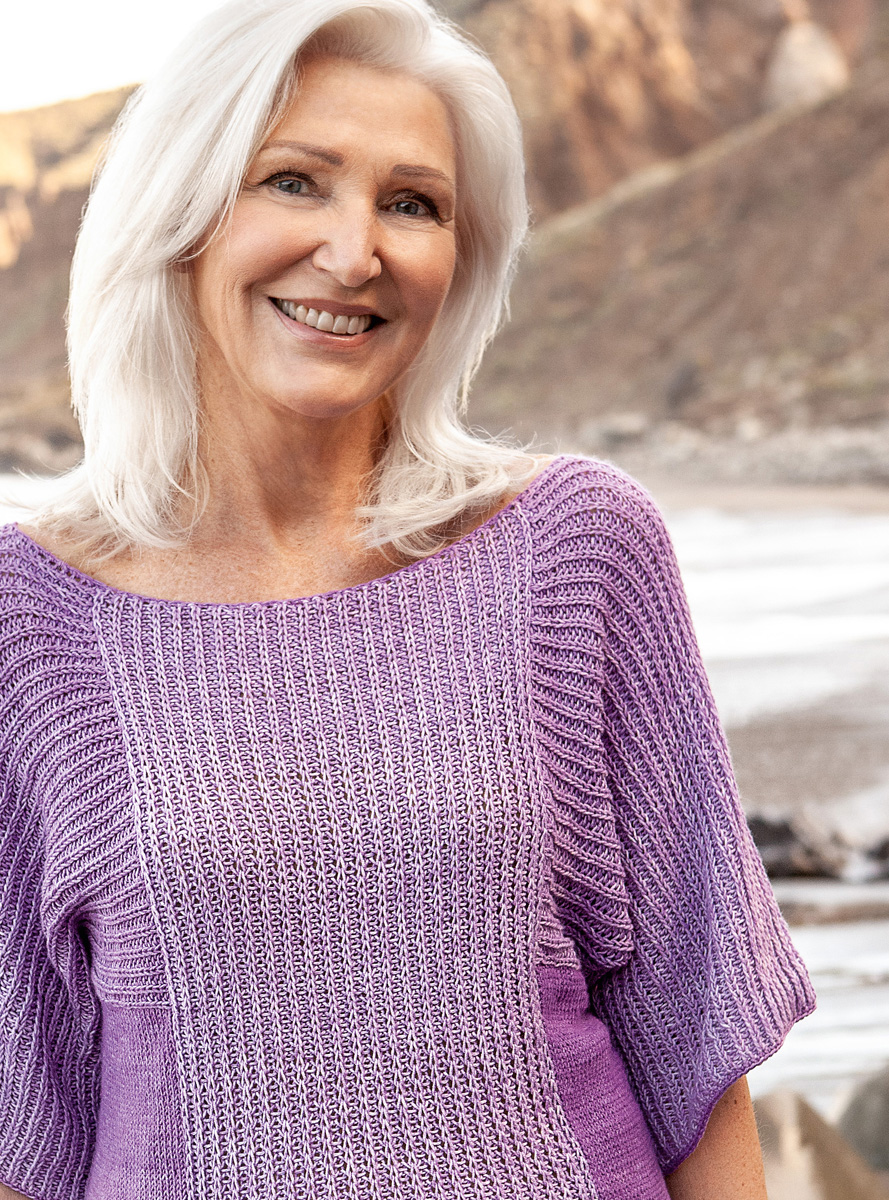 400 g of Lana Grossa Gomitolo Denim (80% cotton, 20% polyamide; 740 m/200 g) in Purple (col 6). Size 4 mm needles; size 3.5 mm crochet hook