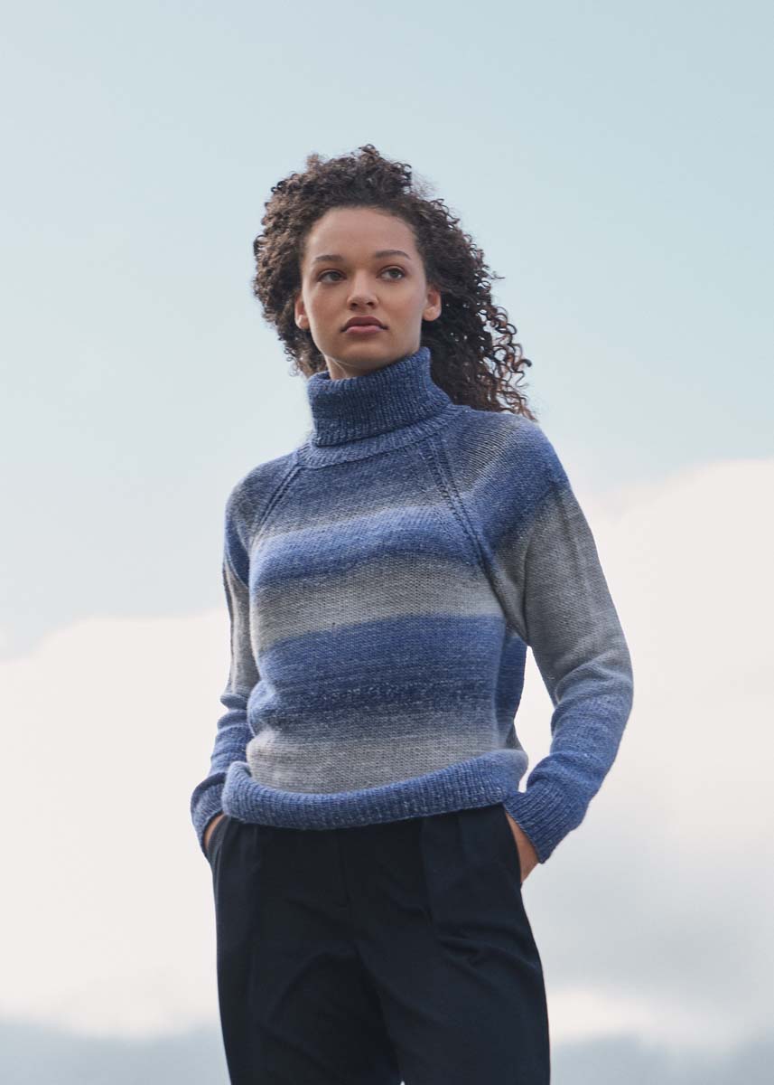 400 (400, 400, 600) g of Lana Grossa Gomitolo Gala (60% pure wool, 38% acrylic, 2% polyester; 700 m/200 g) in Grey/ Grey Blue/Steel Blue/Marine/Sapphire/Light Grey (col 4030). Short and long size 4 and 4.5 mm circular needles; one set size 4 mm double-pointed needles [dpns]; stitch markers