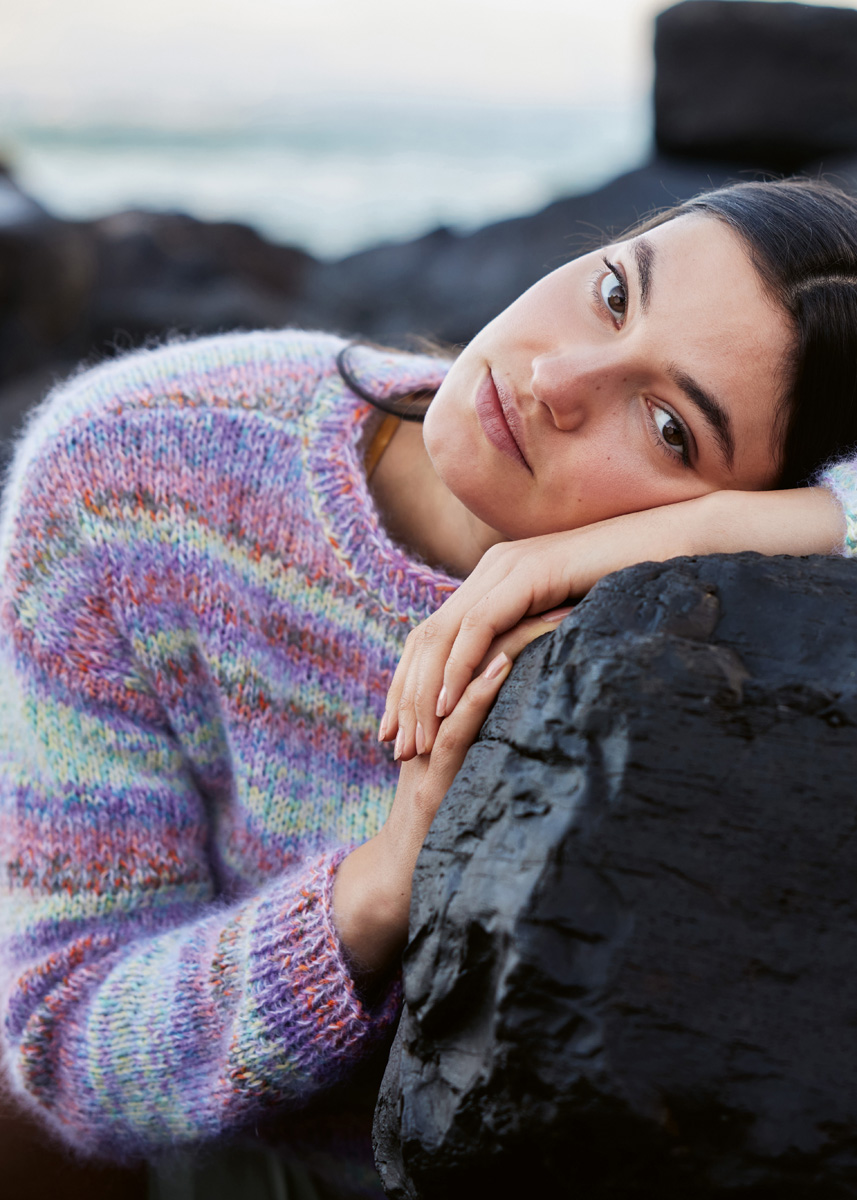 300 (400, 400, 400) g of Lana Grossa Gomitolo Selezione 3 (65% cotton, 35% acrylic; 270 m/100 g) Fuchsia/ Pale Green/Dark Green/Mint/Orange/Brown (col 3006) and 100 (125, 125, 150) g of Lana Grossa Silkhair (70% superkid mohair, 30% silk; 210 m/25 g) in White (col 117). Size 5 and 5.5 mm needles; short size 5 mm circular needle