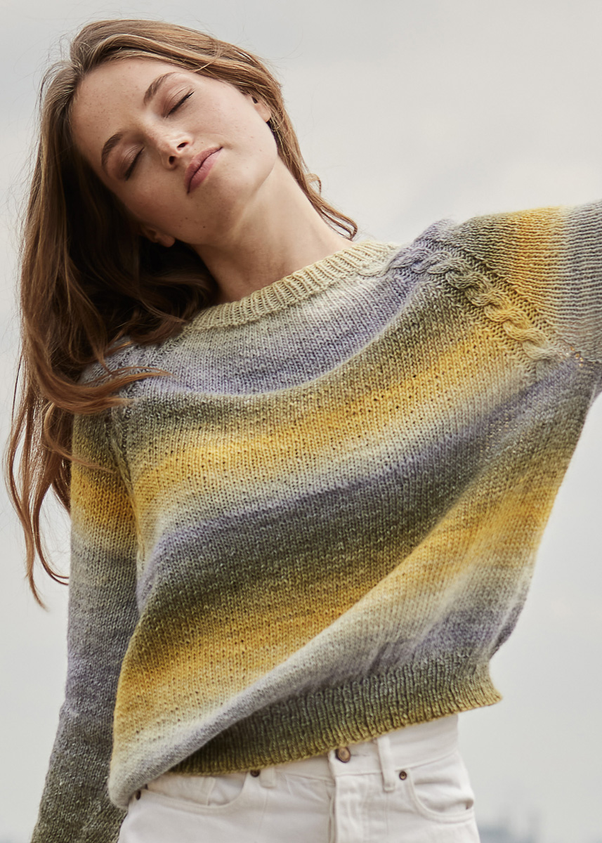 400 (400, 400) g of Lana Grossa Gomitolo Versione (60% pure wool, 40% acrylic; 700 m/200 g) in Slate-/Concrete-/Light Grey/Vanilla/Yellow (col 430) or Petrol Blue/Grey Brown/Taupe/Orange/Marine (col 428). Short and long size 3.5 and 4 mm circular needles; one set each size 3.5 and 4 mm double-pointed needles [dpns]; cable needle [cn