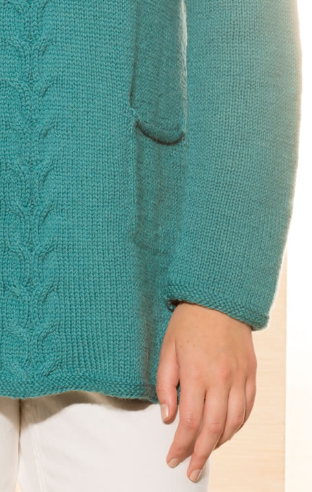 500 (550, 600) g of Lana Grossa Cool Wool Alpaca (70% Merino wool, 30% baby alpaca; 50 g = 140 m) in Petrol Green (col 17). Size 4 and 4.5 mm needles; size 4.5 mm circular needle, 40 cm long; cable needle [cn].