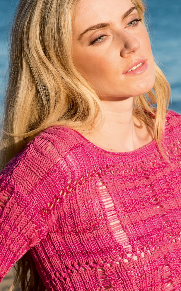 With drop stitch pattern and an impulsive magenta tone this pullover proves to be a hip styling-partner.