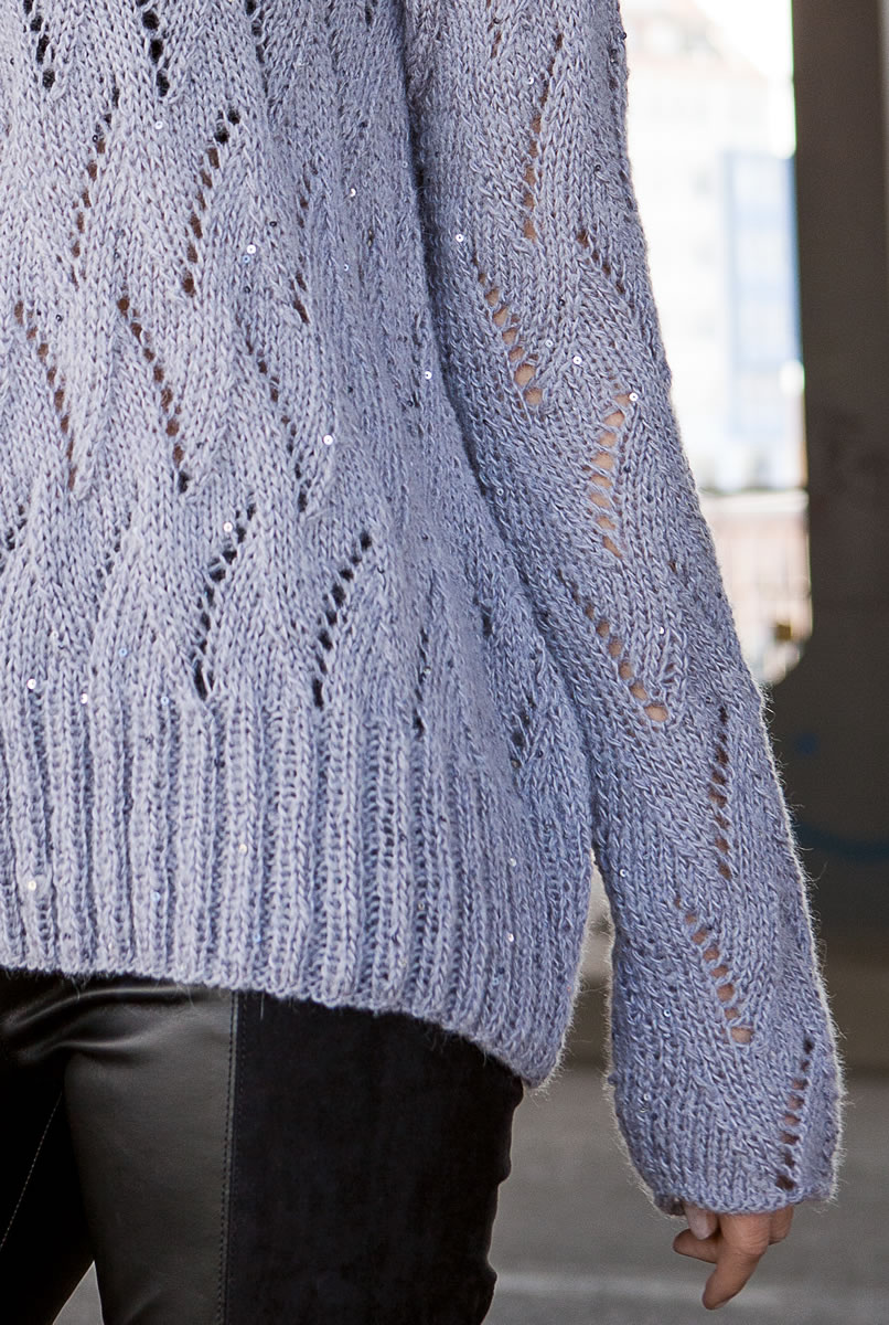 200 (250, 300) g of Lana Grossa Lace Seta (70% alpaca, 30% silk; 250 m/50 g) in Purple/Grey (col 3) and 150 (175, 200) g of Lana Grossa Lace Paillettes (45% alpaca, 20% pure wool, 15% polyamide, 15% cotton, 5% polyester; 150 m/25 g) in Grey/Purple (col 26). Size 5 and 5.5 mm needles; size 5 mm crochet hook.