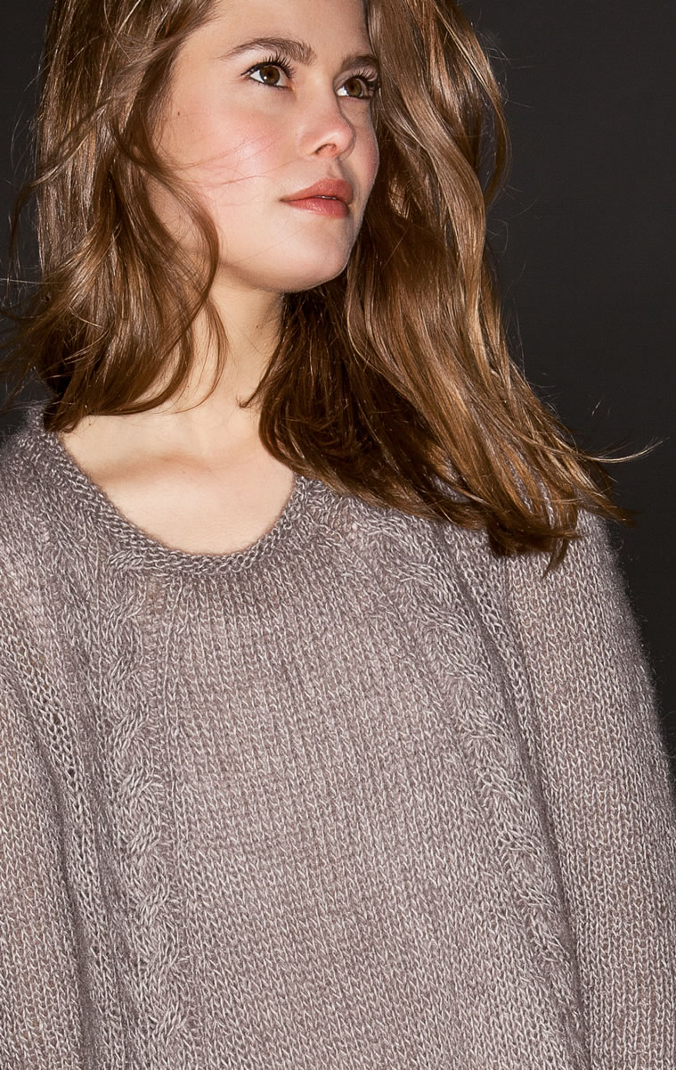 200 (250, 300) g of Lana Grossa Lace Seta (70% alpaca, 30% silk; 250 m/50 g) in Stone (col 5) and 125 (150, 175) g of Lana Grossa Silkhair (70% mohair, 30% silk; 210 m/25 g) in Taupe (col 35). Size 6 mm needles; size 6 mm circular needle, 40 cm long; cable needle [cn].