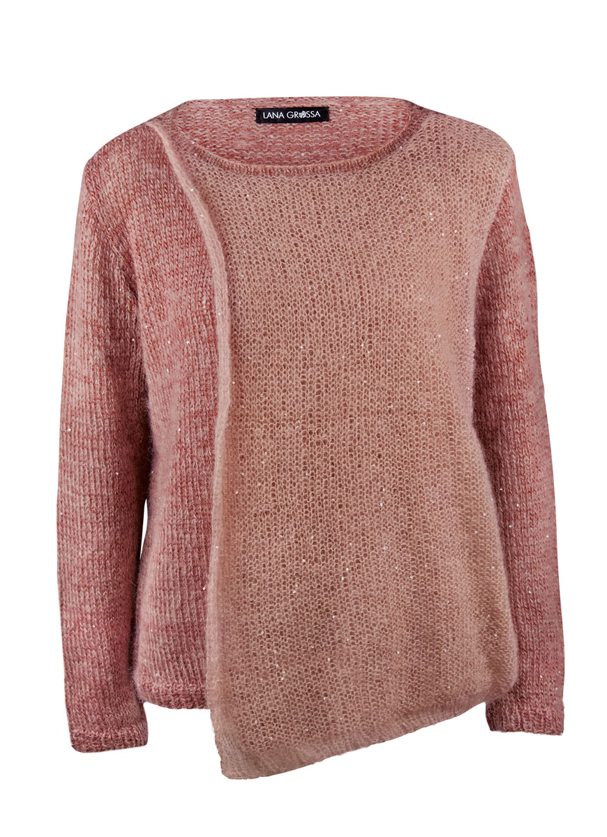 100 (150, 200) g of Lana Grossa Lace Seta (70% alpaca, 30% silk; 250 m/50 g) in Heathered Pink (col 7) and 150 (175, 200) g of Lana Grossa Silkhair Paillettes (61% mohair, 17% polyamide, 11% silk, 11% pure wool; 155 m/25 g) in Antique Pink (col 402). Size 4.5 and 6 mm needles; size 4.5 mm circular needle, 40 cm long