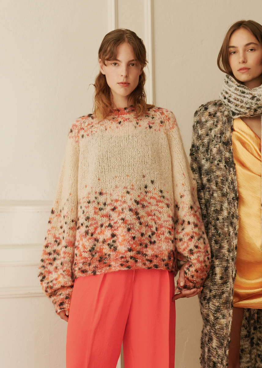 200 g of Lana Grossa Lala Berlin Brushy (42% superkid mohair, 38% Merino wool, 20% polyamide; 135 m/50 g) in Pink/Orange/Coral/Wine/Black Brown (col 101) and 250 g in Beige (col 7). Size 5 and 6 mm needles; size 5 mm circular needle, 50 cm long