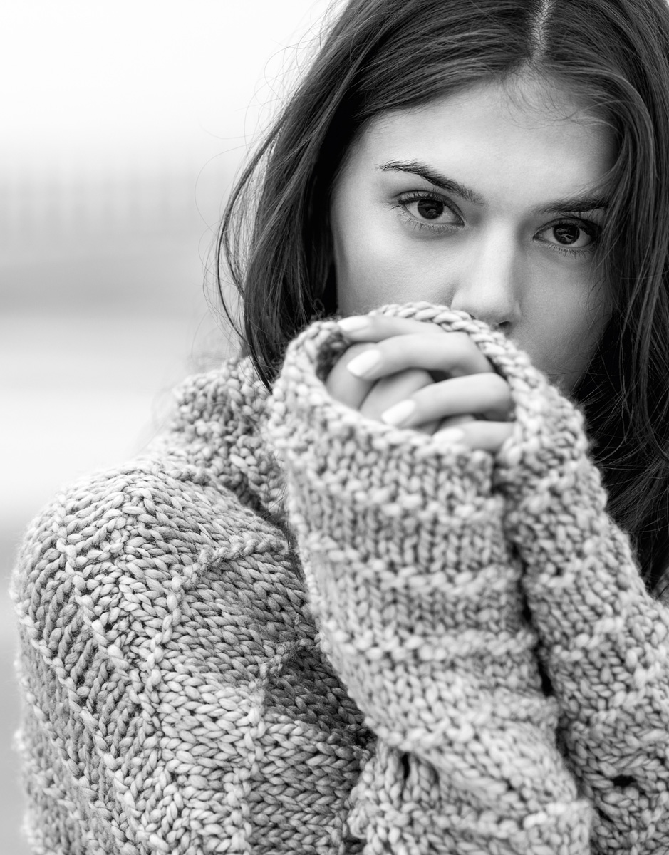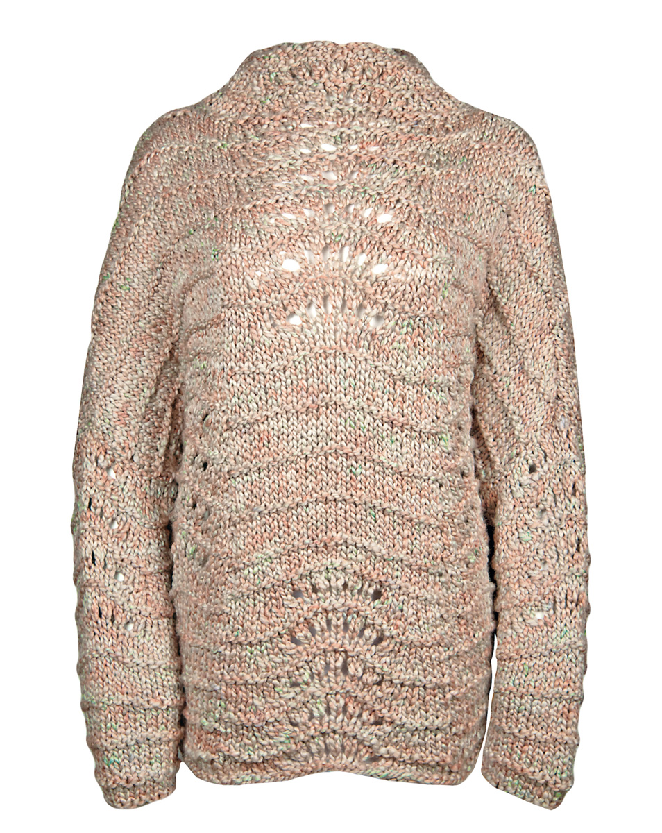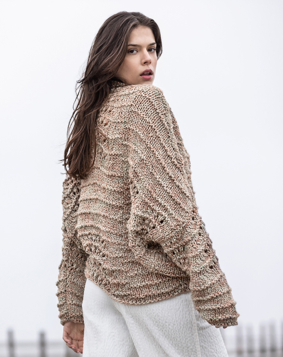 700 (750, 800) g of Lana Grossa Lala Berlin Chunky (80% pure wool, 15% silk, 5% polyamide; 50 m/50 g) in Green-Grey/Pastel Orange (col 106). Size 10 needles